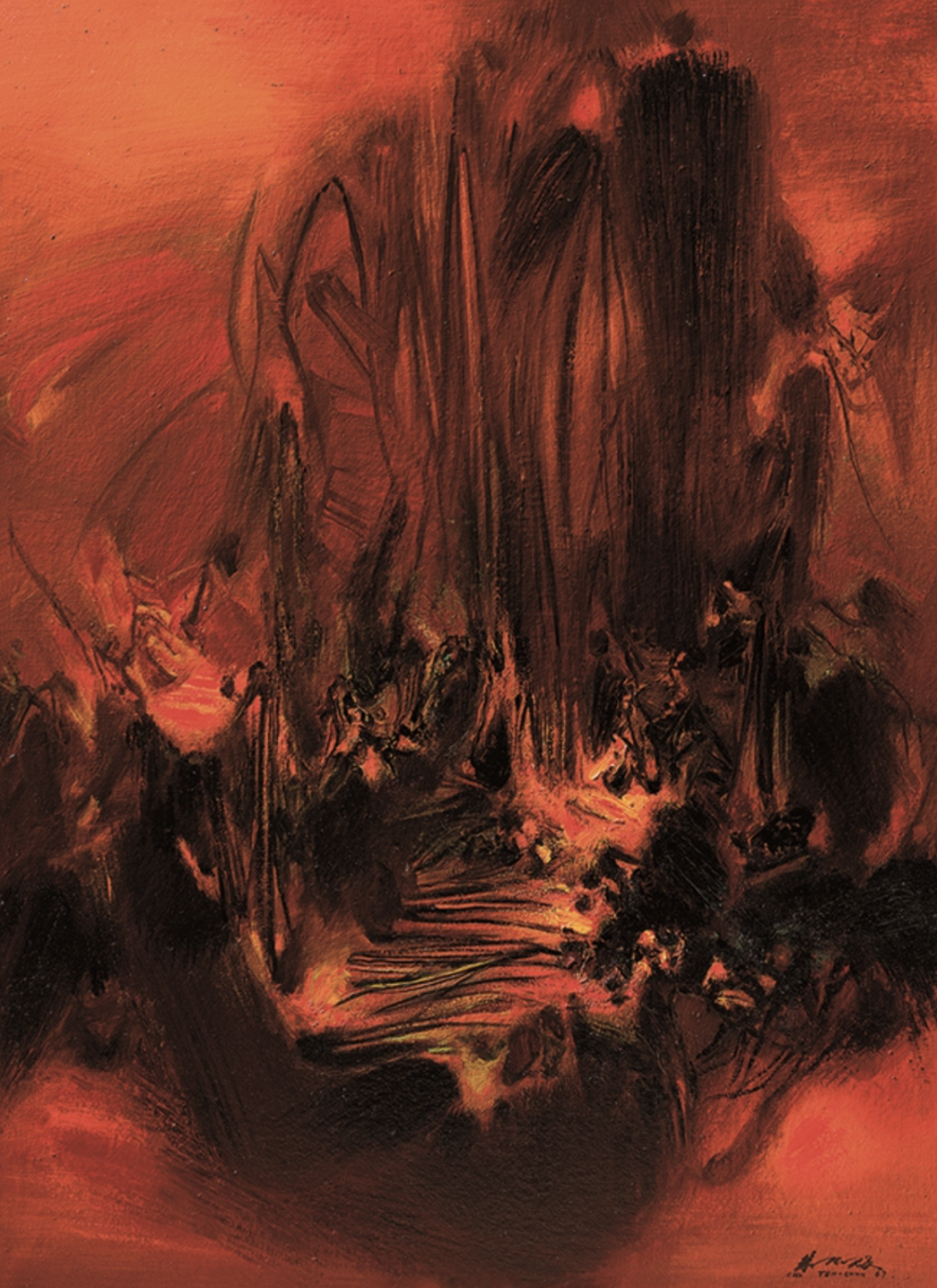 《辉煌 NO.246》是朱德群探索抽象绘画进程中具有典型意义的佳作。堆叠的黑色线条具有强烈的压迫感,锋芒毕露中传递出情绪的共振;鲜亮的红色瞬间点亮了画面,营造出一种内部充盈着光芒的独特美学样式。展现出抽象风景与纯粹氛围的完美融合,将抽象绘画对本质的表达和诗意的传递表现的淋漓尽致。
