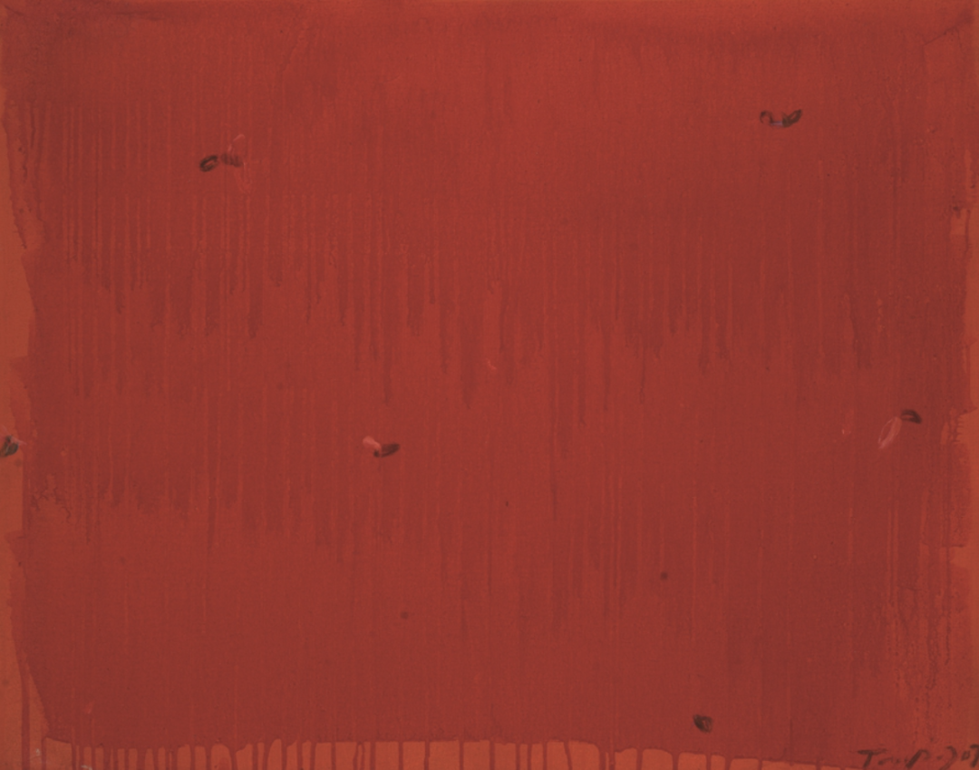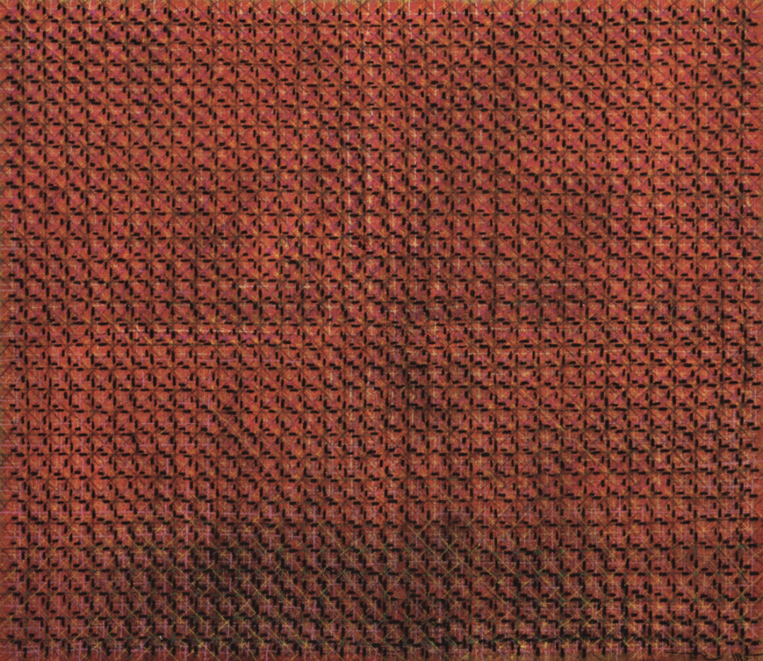 其中,创作于2007年的《无题》中,大片浓重红色象征着宇宙的初始状态及母体孕育生命的过程。艺术家运用单一的色彩和简约的点、线、面来呈现表层图像背后隐匿的多层涵义和隐喻,并增加了偶然性和不确定性的表达,利用一种看似无目的的布局诠释出关于时间与空间的整体体验。