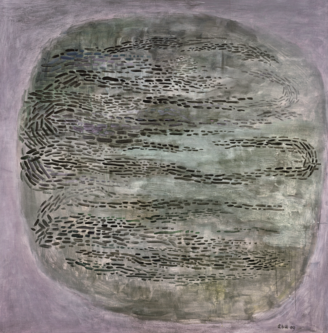 即将上拍的《2009.9.29》(Lot 2051)为“圆”系列的代表。画面中,深浅不一的笔触,渐次排开,顺势环绕,向周围分散,再向中心汇聚,最终嵌合成一个整体的圆。其中,阴与阳、有与无、动与静、聚与散等,既相互排斥,又相互吸引地共处于一个和谐的统一体中,这一阴阳互根的艺术理念来源于余友涵对老庄道家哲学思想的体会,亦来自于他对生命和自然的感悟。