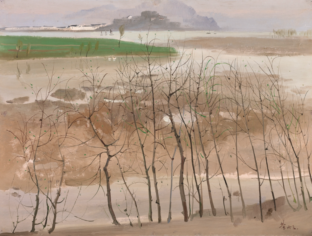 创作于1963年的《富春江沙洲》描绘富春江的早春形象,艺术家在油画中融入了水墨画的元素,将欧洲油画的自然主义、丰富细腻的色彩与中国传统绘画的审美精神交融在一起。吴冠中后期作品中的点、线、面交错纵横的抽象形式,在此作中亦可见端倪,色度不同的块面和线条的搭配营造出生动的节奏、韵律和诗意,在具象和抽象之间展现出一种富有视觉张力的表现形式。