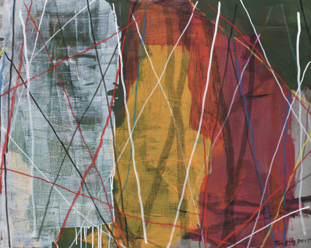 2015年,谭平对抽象形式和材料的探索又进入一个新阶段,其造型语言虽仍以涂绘和覆盖为主,并借鉴了一些书法和水墨中的技巧,其作品中的色块、线条和笔触更加自由灵动,空间设置和色彩层次亦更加丰富,此幅《满落尘埃的爵士乐》即为其中代表作,预示着谭平的艺术从“画它”、“画我”,进入到“我画”的自由之境。
