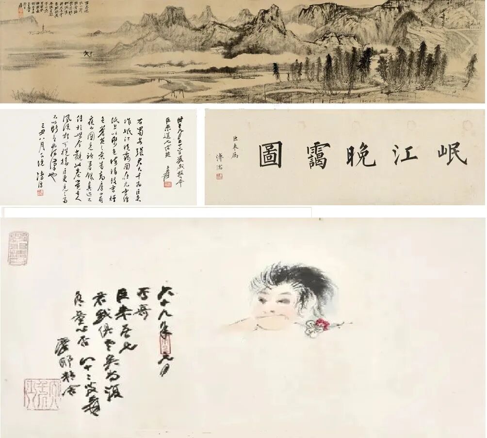 1948年,陈的父亲渭渔老人病重,每日需服羚羊角,这是很贵重的药剂,颇感力不能胜,大费踌躇。大千闻知,立绘一仕女、一山水见赠,都是单款,便于善价而沽。这山水为一手卷,用的是元人写经纸,水墨不设色,很为高古,以纸色灰暗,题为《岷江晚霭图》。渭渔老人看后爱不忍释,曾说:“其他画都可割让,这画留以自赏了”。