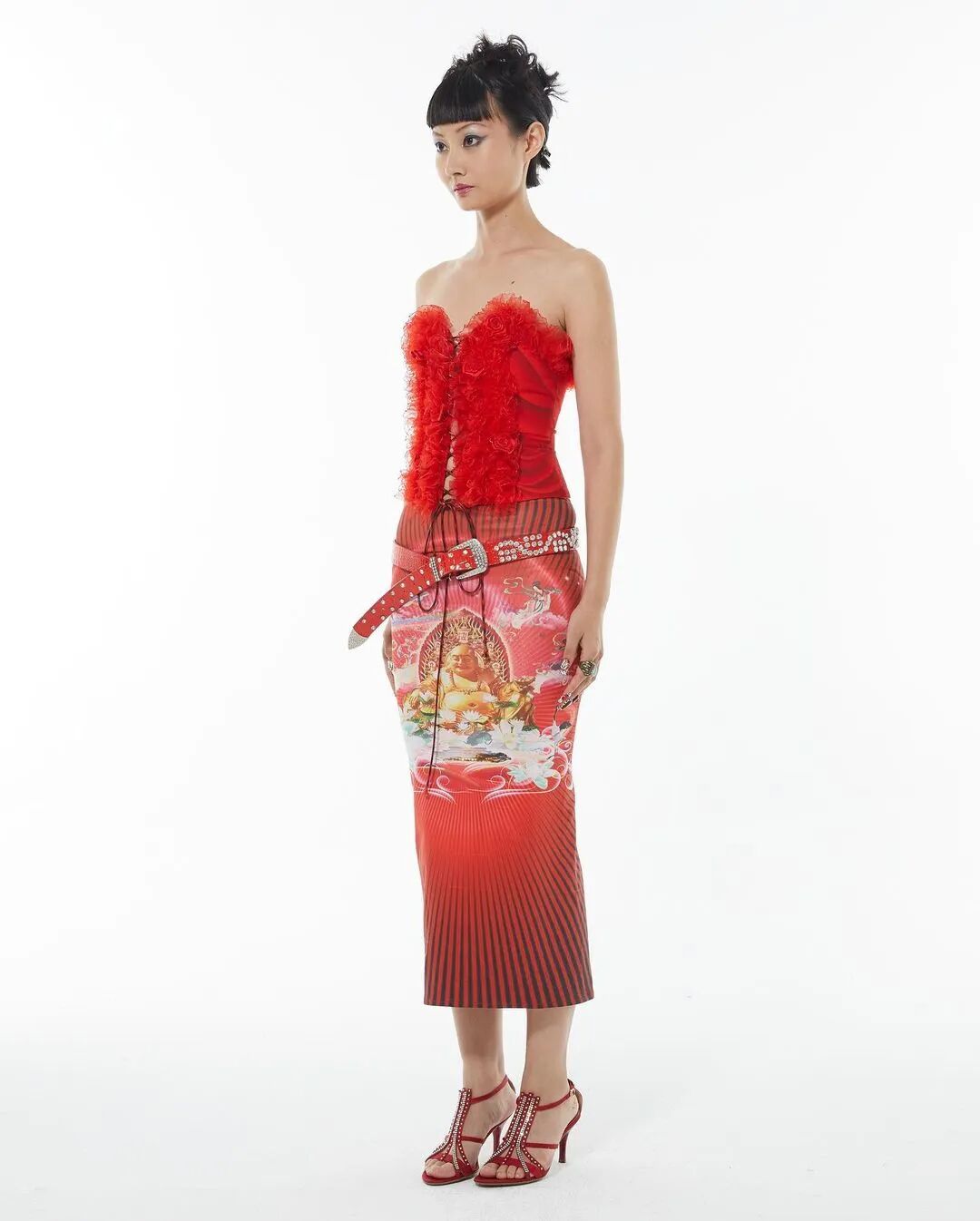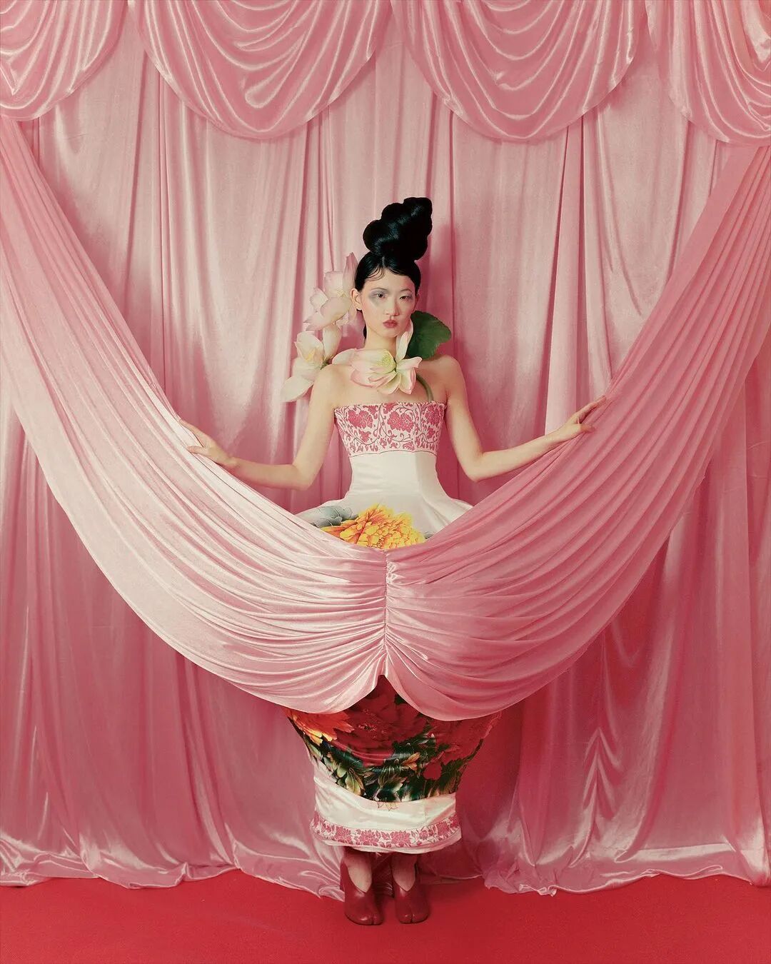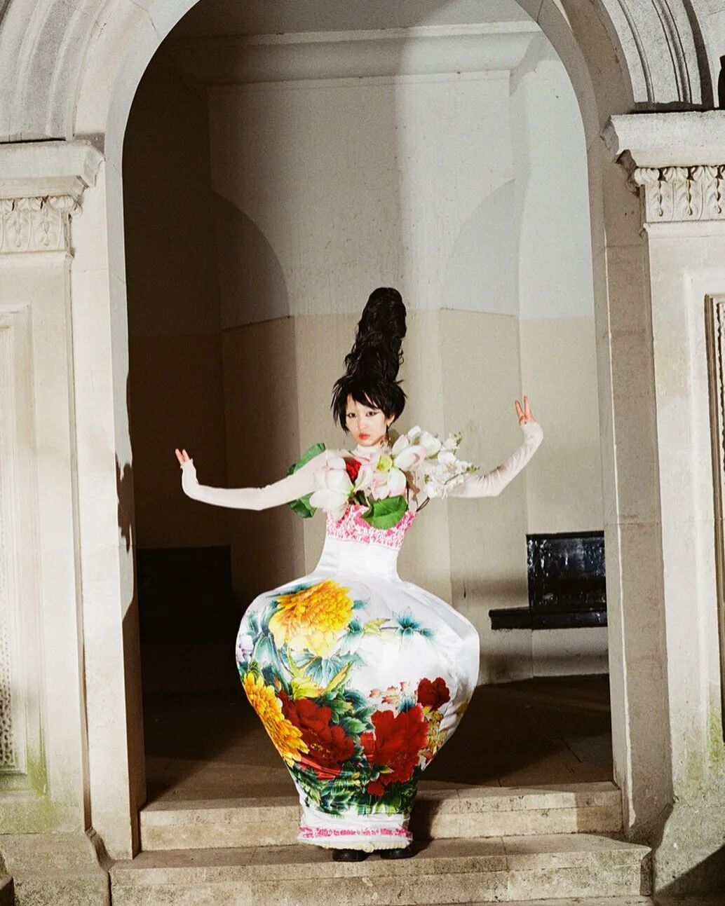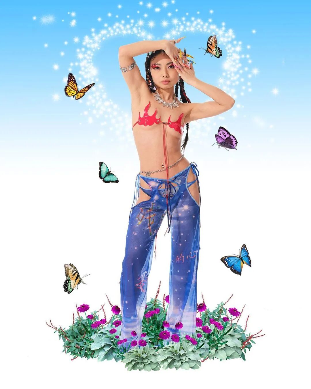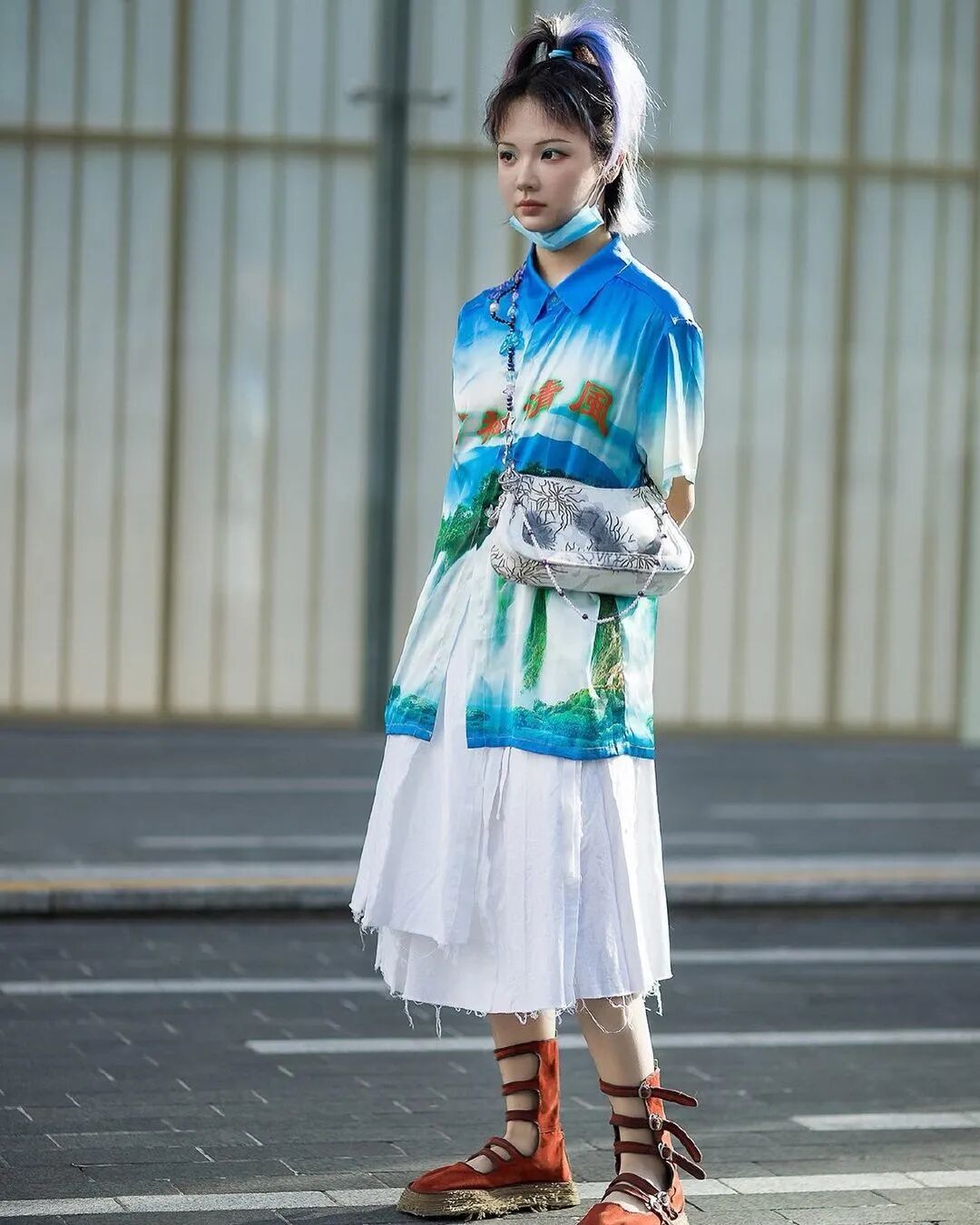早期(2020年),HuDieGongzhu的设计也许会让人觉得非常“辣眼睛”,是真的让人亚到语塞的程度……但随着品牌和设计师的不断成长,不得不承认HuDieGongzhu确实也有了一些改变,无论是印花的选择、服装的配色还是款式的设计,都在“新中式”“辣妹装”“千禧风”中寻求最合适的融合点。