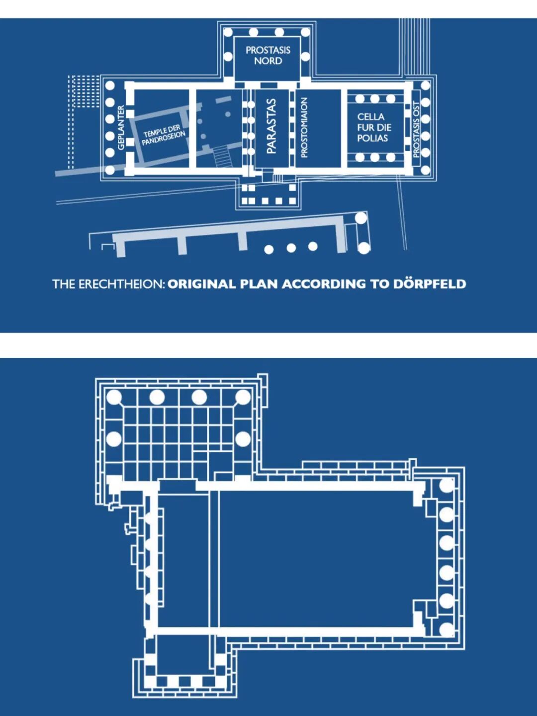 相较于单纯、恢弘而严整的帕特农神庙多立克式(Doric),伊瑞克提翁是一座朝东的六柱门廊式(hexastyle)爱奥尼克/爱奥尼亚(Ionic)神庙。这意味着它的柱子要纤细一些,甚至还有一些嵌入墙体的半身柱(engaged column/half column);细部的装饰也更多样化、精致化,除了各种复杂的脚线(molding),还镶嵌玻璃、贴上黄金,甚至用蓝色石灰岩作为雕带(frieze)的基底,与上面白色大理石的雕刻人物形成天然的色彩对比。虽然我们已经无法根据现有的文物遗存像帕特农神庙一样去较完整地复原伊瑞克提翁神庙的雕带内容,但它整体的精雅富丽是完全可以想象的。
