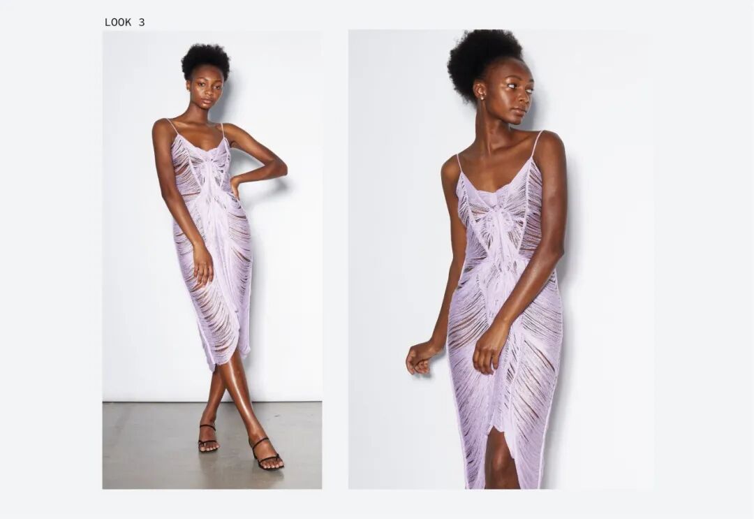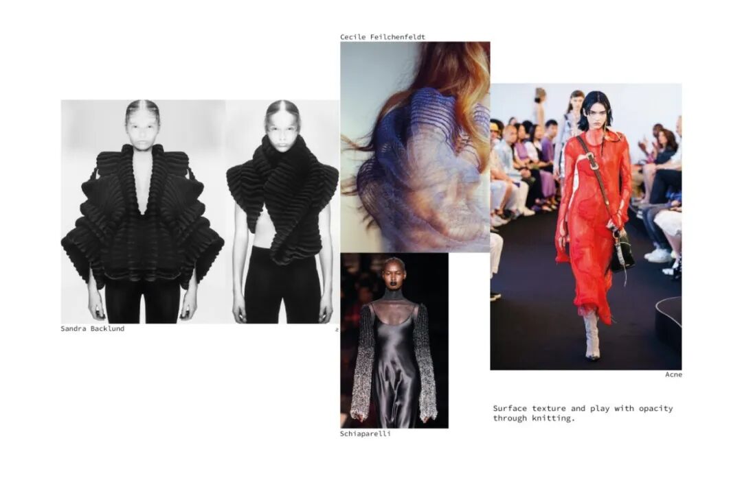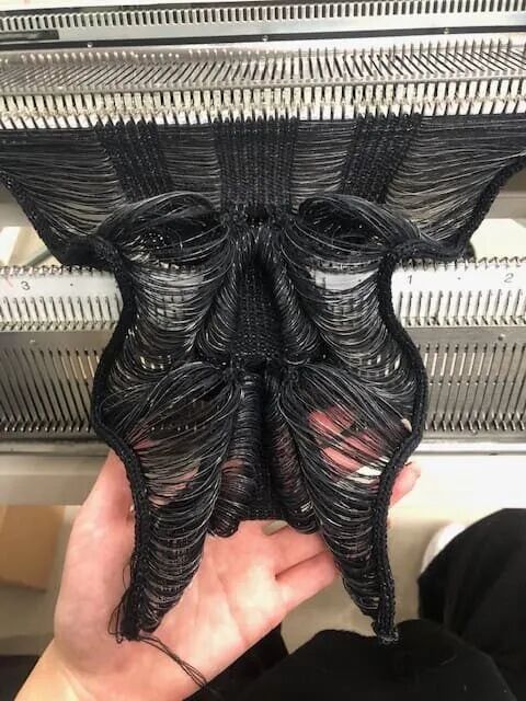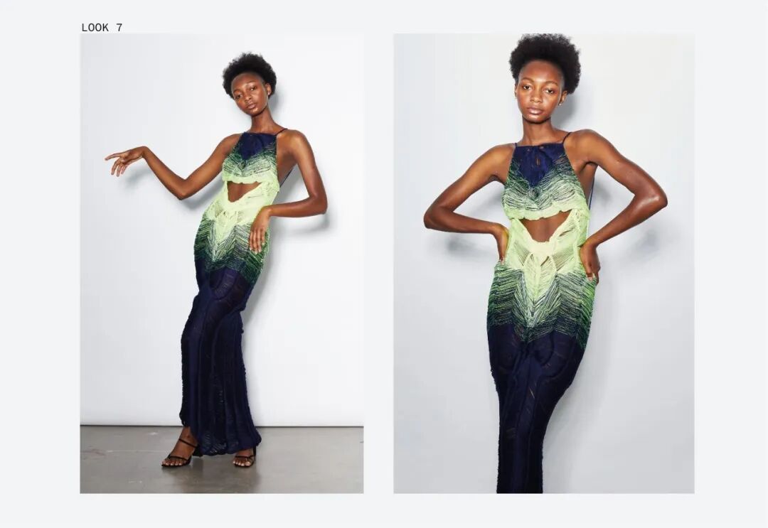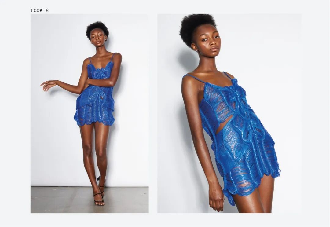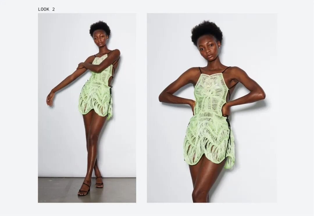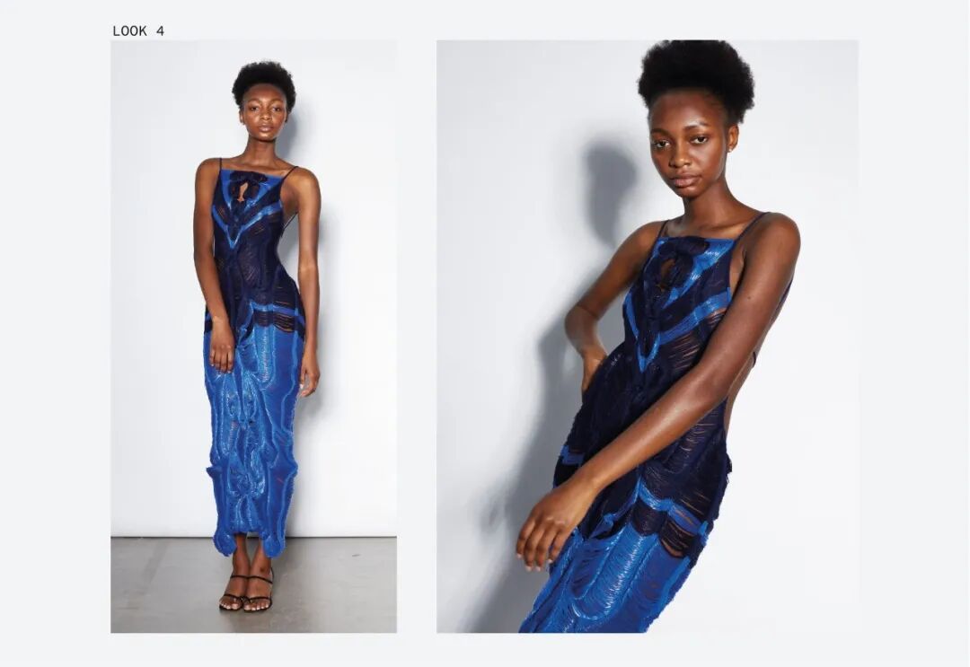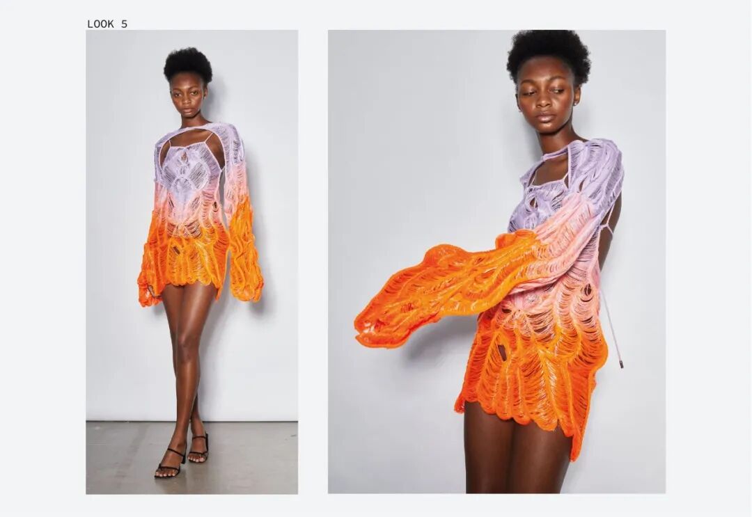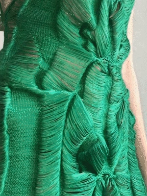 她利用纤维和手工针织机这种单一织造方法,通过组合针法和钩针,形成了3D表面,从而得到面料。这种面料增加了针织服装形态的可变性,在服装构造方面有很独特的优势,与此同时这种技法让她创造了零浪费的高级时装。