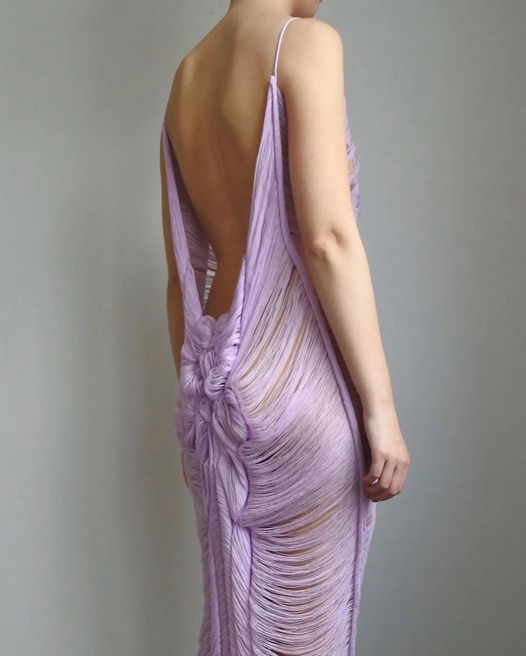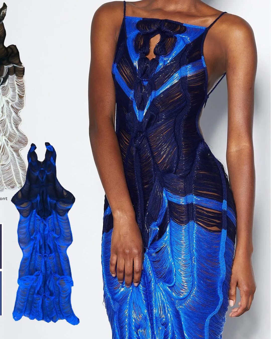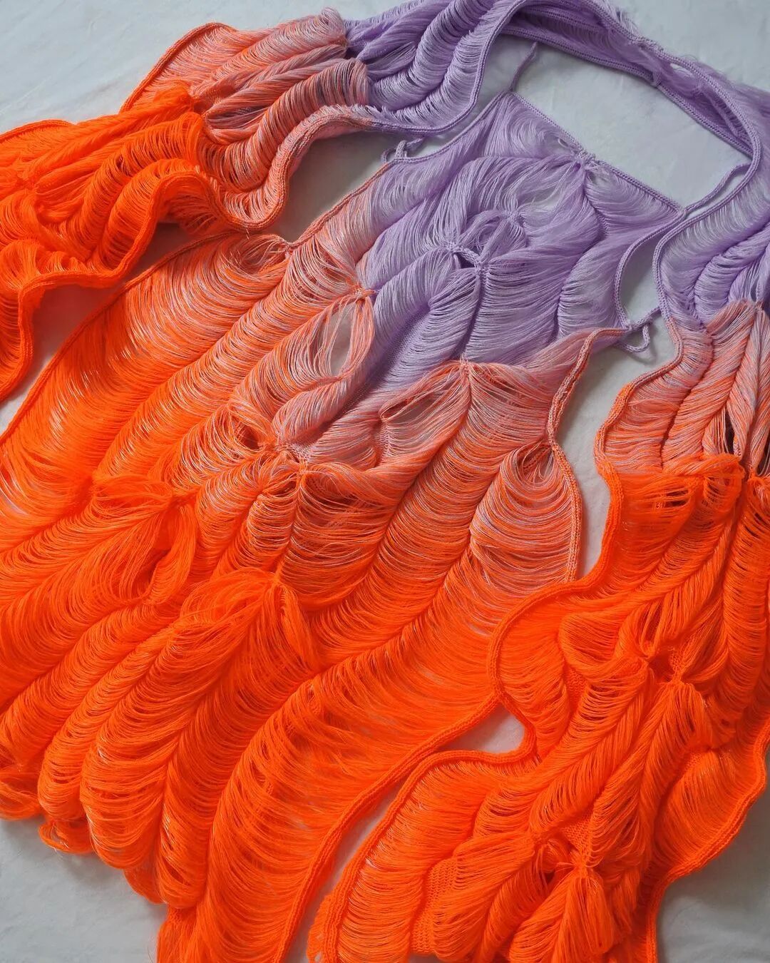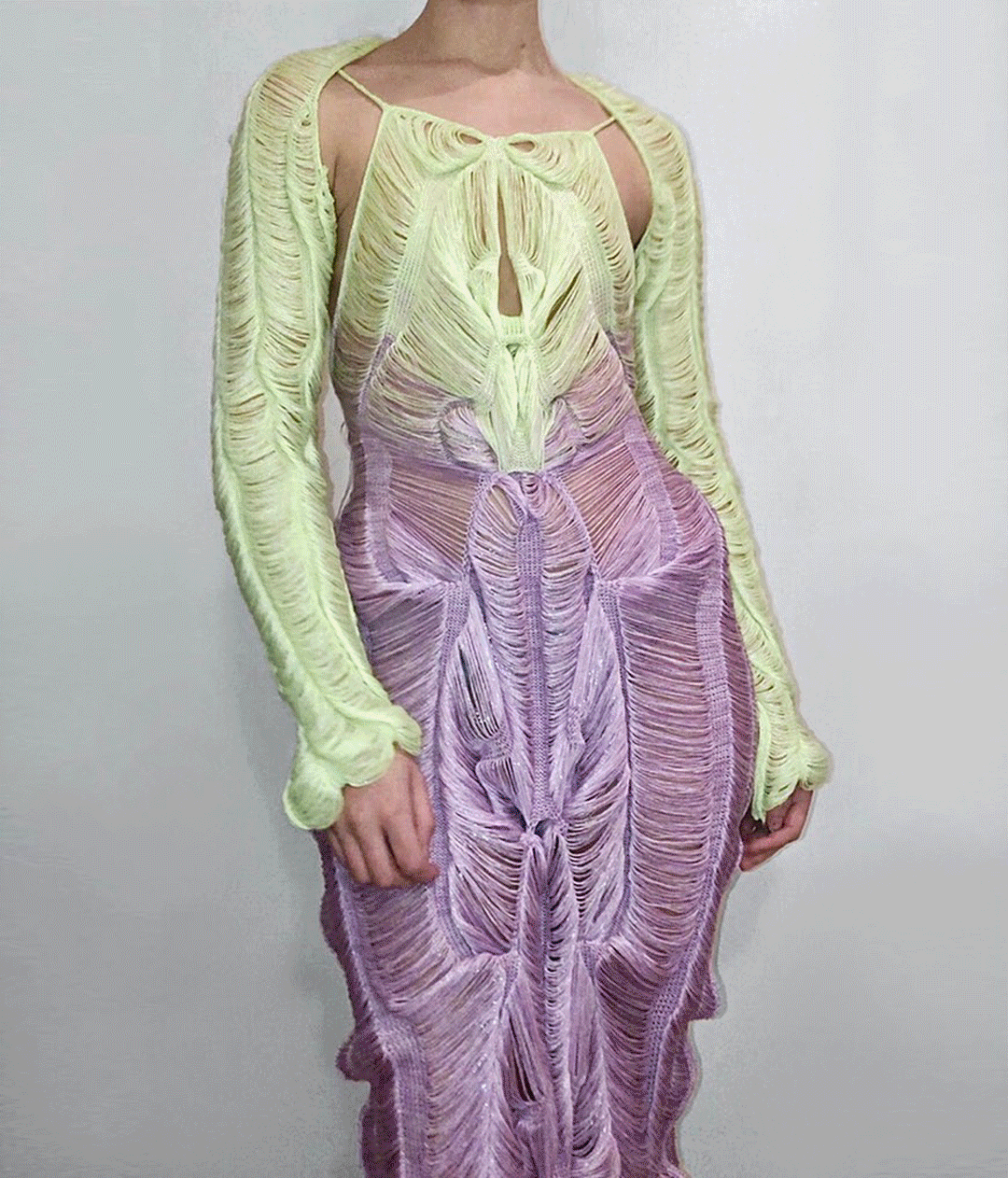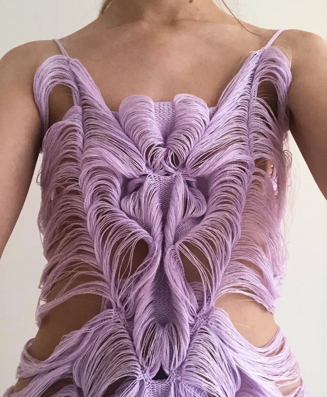 她利用纤维和手工针织机这种单一织造方法,通过组合针法和钩针,形成了3D表面,从而得到面料。这种面料增加了针织服装形态的可变性,在服装构造方面有很独特的优势,与此同时这种技法让她创造了零浪费的高级时装。