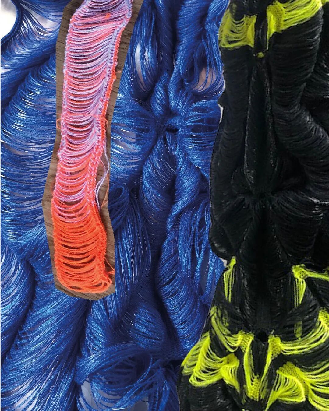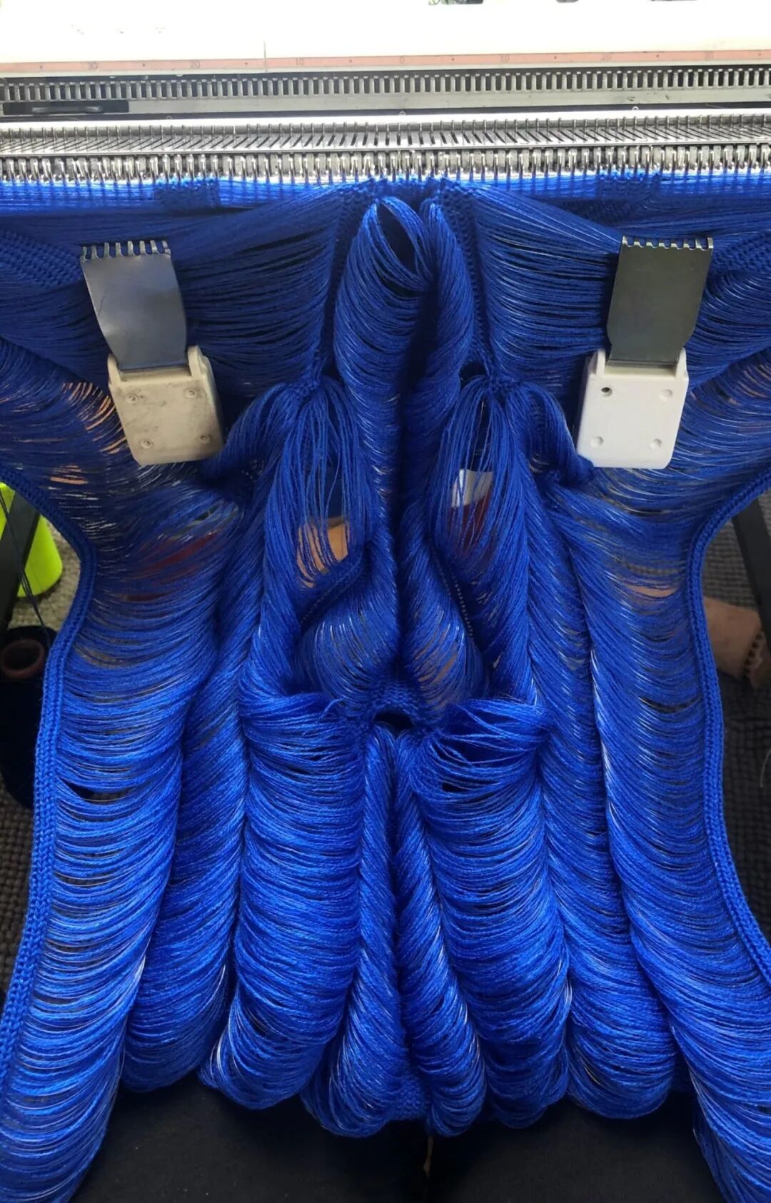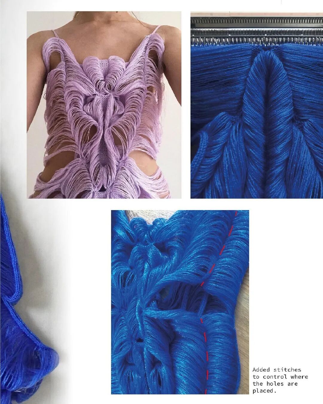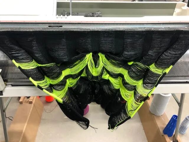 “用手工编织机进行编织,每个接缝针迹和彩色镶嵌都是其手工完成的,因此随着织物从机器中生长出来,我可以看到即时结果并决定如何继续。”