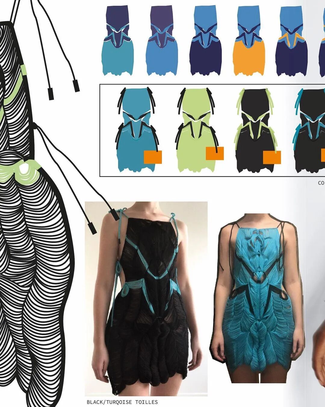 Emma的毕业设计灵感来自水下生物,将有机动物的形状和它们的不透明性转化为可穿戴的衣服。它们拥有明亮的对比色调,包括绿色,橙色和蓝色。通过结合浮动和钩针,她创造出了具有3D表面,具有运动元素和维度的针织服装。