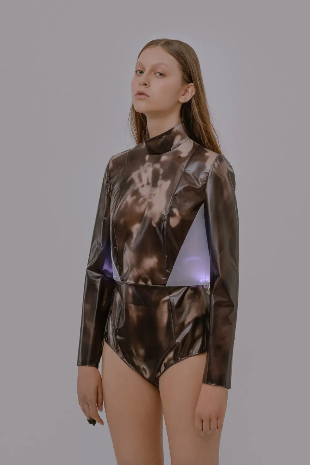 最终,她利用氯丁橡胶、热塑性聚酯或聚氨酯合成革、聚乳酸塑料等组合材料制成上衣,这种衣服应该能够反映人类皮肤状态的变化。