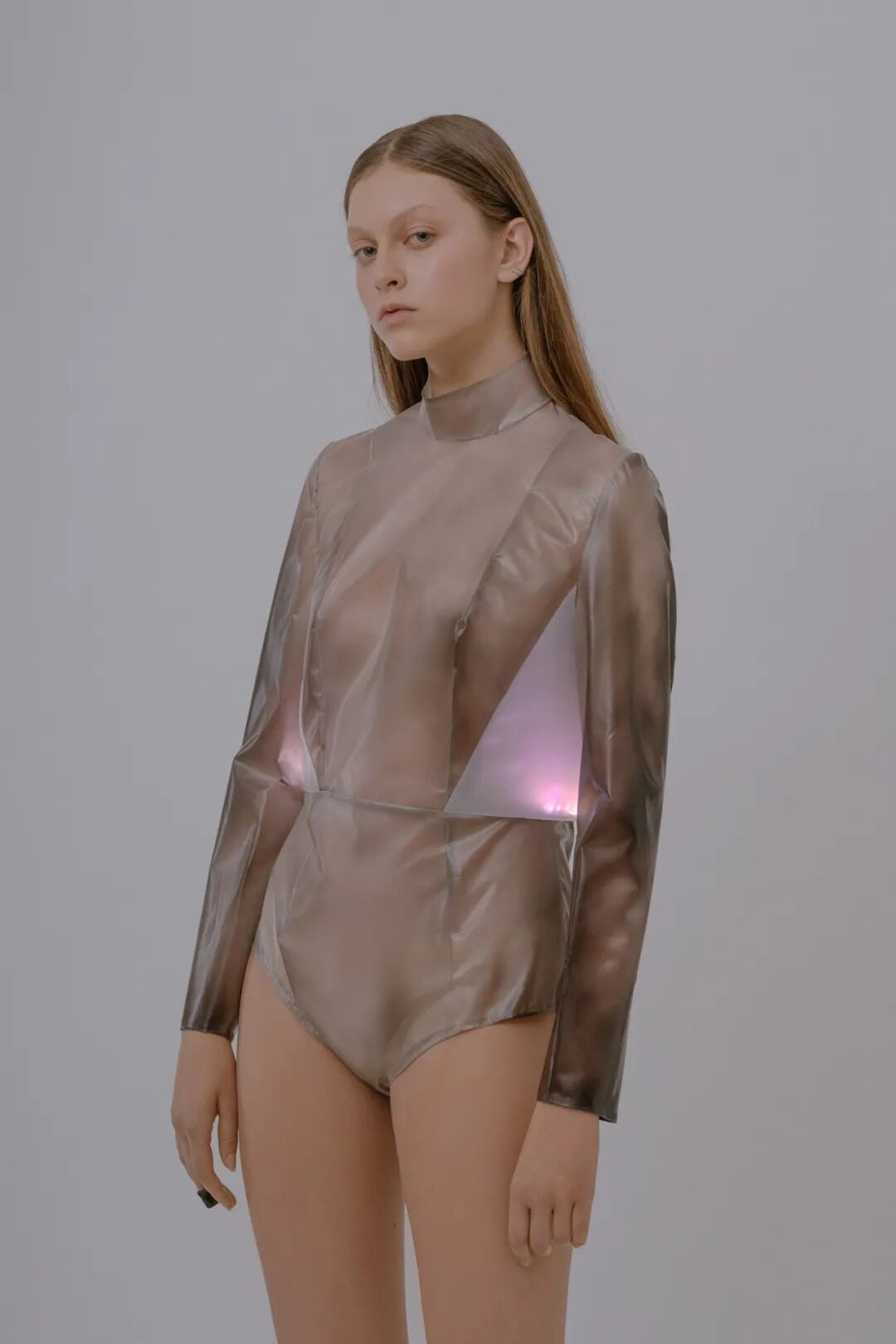 另一款蓬松气球状廓形上衣,特点是胸部上方有一串粉红色 LED 灯。LED 灯可感知皮肤汗液水平变化,从而测量压力高低。