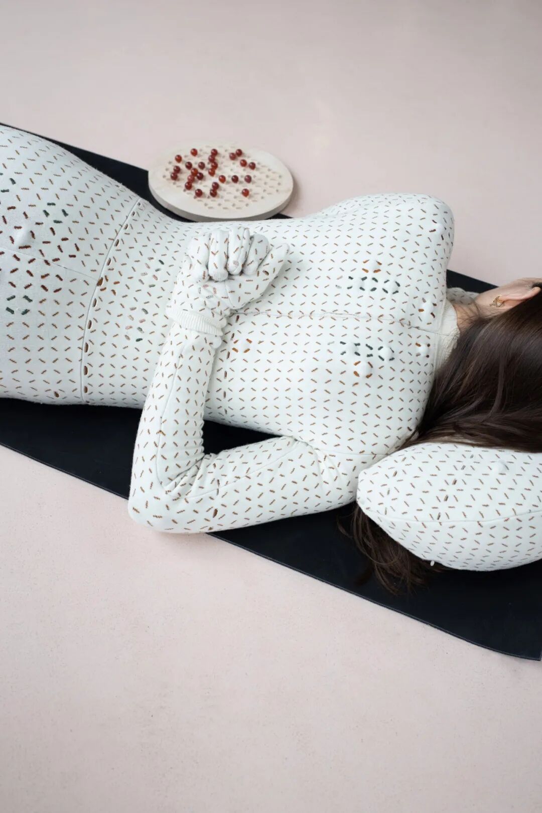 Deschl 制作了定制针织服,衣服上缝有网格,方便塞入小号按摩球,移动到身体、足部、手部和头部的特定指压点。