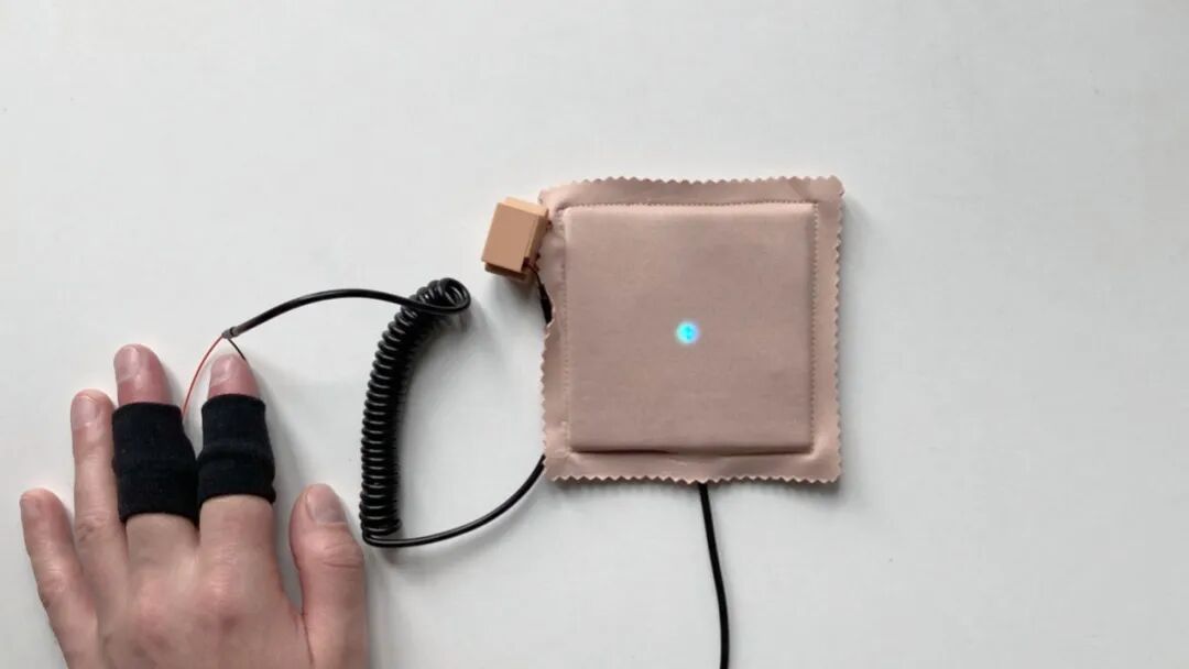 传感器将从汗水上感知到的信号发送到沿着手臂和颈部的白灯上。当颜色由暖转冷时,意味着需要放慢呼吸、平静下来。