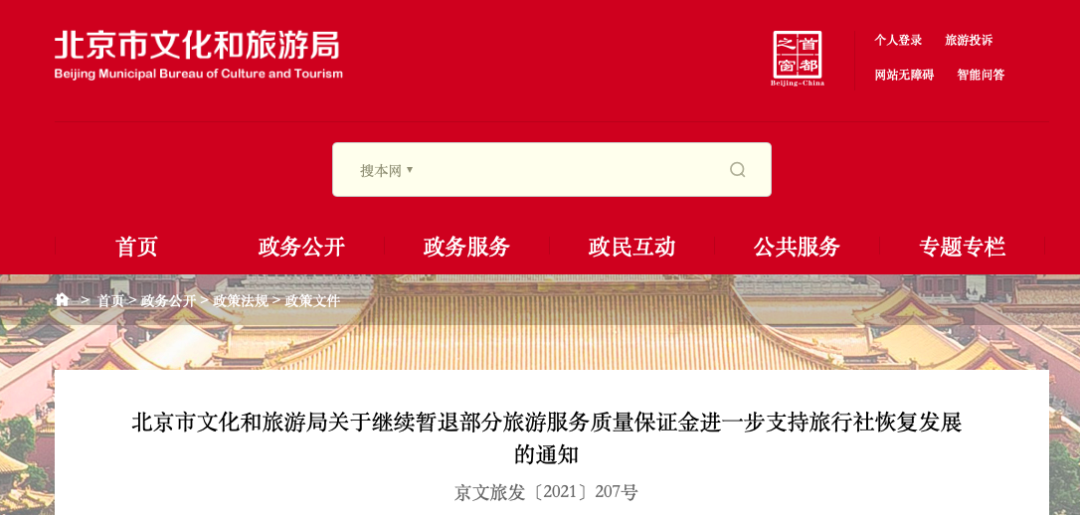 11月中旬,北京市文化和旅游局发布《关于继续暂退部分旅游服务质量保证金进一步支持旅行社恢复发展的通知》,明确在暂退范围内的全市旅行社可继续申请暂退部分保证金,并延长补足期限。