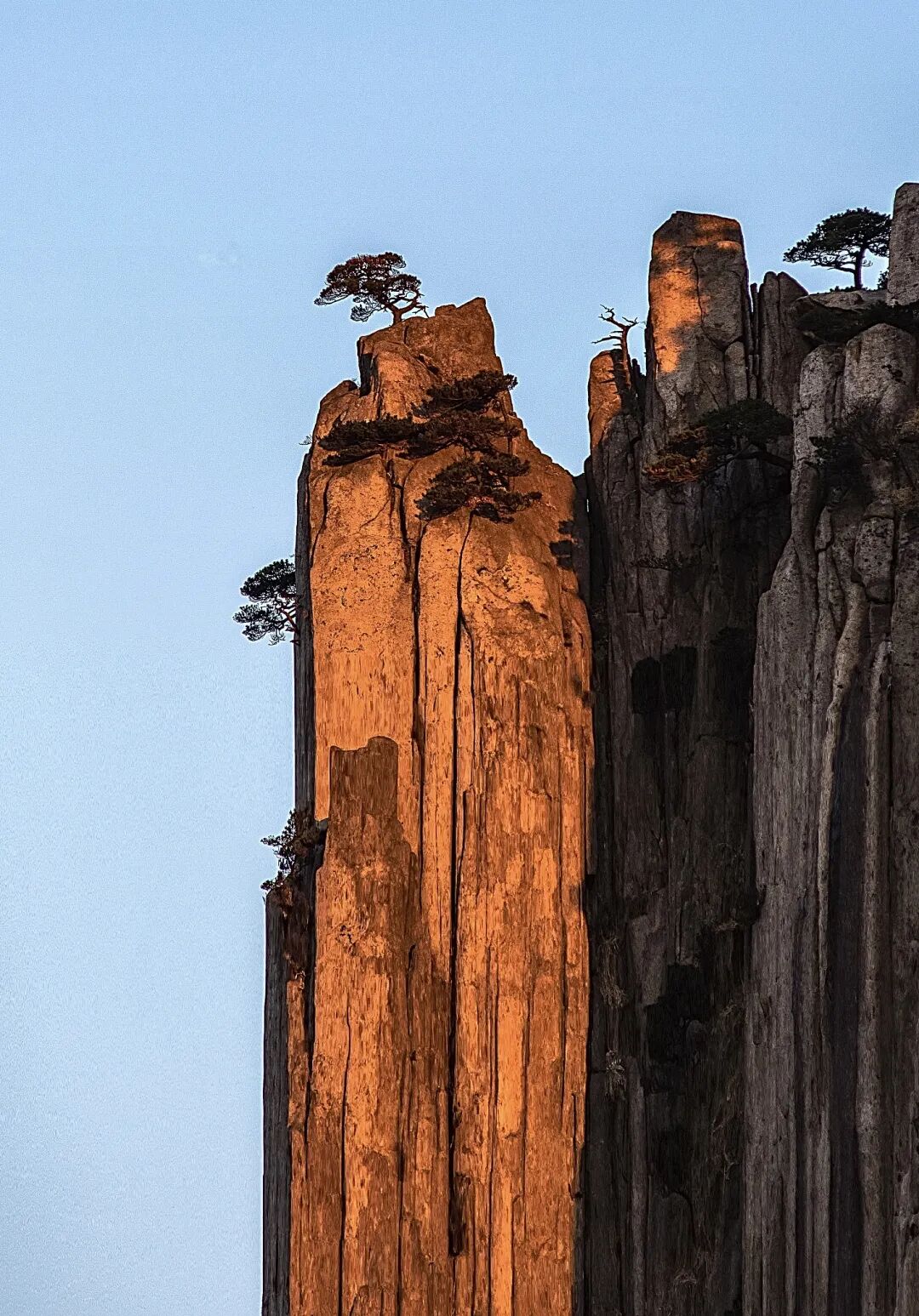 比如黄山是火成岩地貌,高耸雄健的花岗岩岩体在长久的剥蚀中逐渐浑圆,雄浑凝重是花岗岩山的特色。
