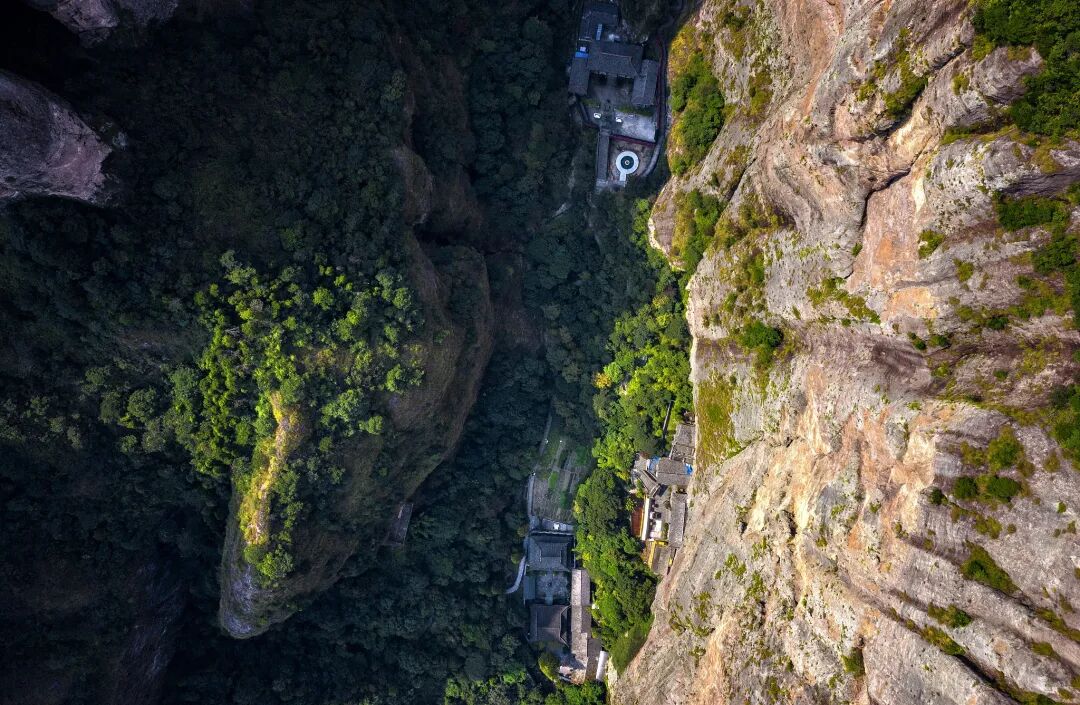 观音洞的庙宇就在合掌峰的裂隙中,远远望去,依稀可见崖壁岩隙中的一层层楼阁,天然环境为佛寺加持了神秘色彩。