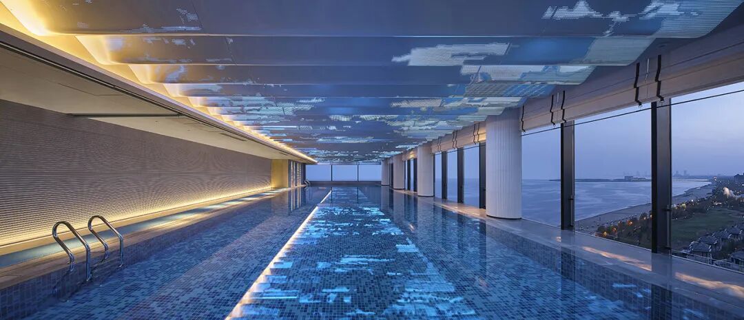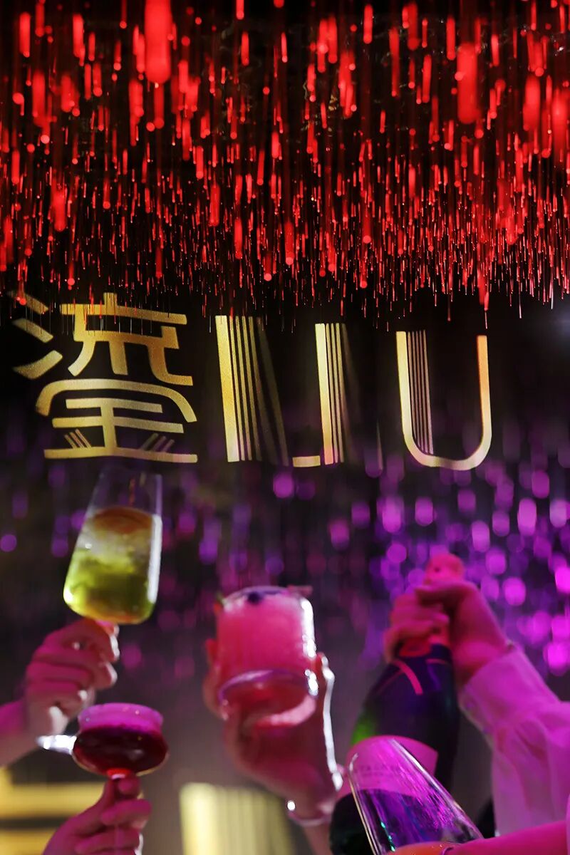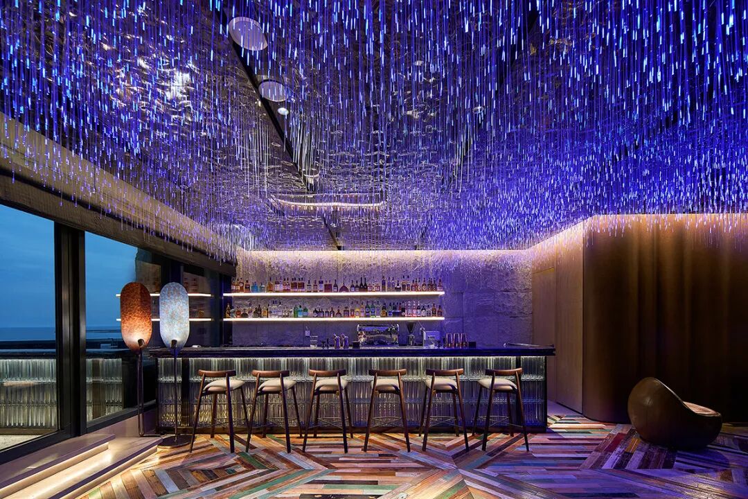 鎏酒吧与无边际室外泳池相连,金属质感的墙体和流光溢彩的灯光,旧船板为原材料而打造的地板,时尚复古。20米长的流水型吧台,由室内延伸到户外,自由随性。