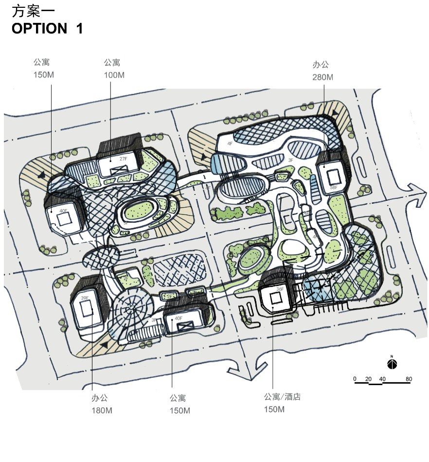 基地的东北、西北两个主要街角拥有便捷的交通、沿湖景观和城市展示面,是办公、酒店主塔楼的最佳落位区。本案的办公、SOHO产品体量巨大,为多塔楼布局,因此必须在控制好塔楼栋数的同时,考量市场等因素,对标准层的形式进行产品类型的细分。
