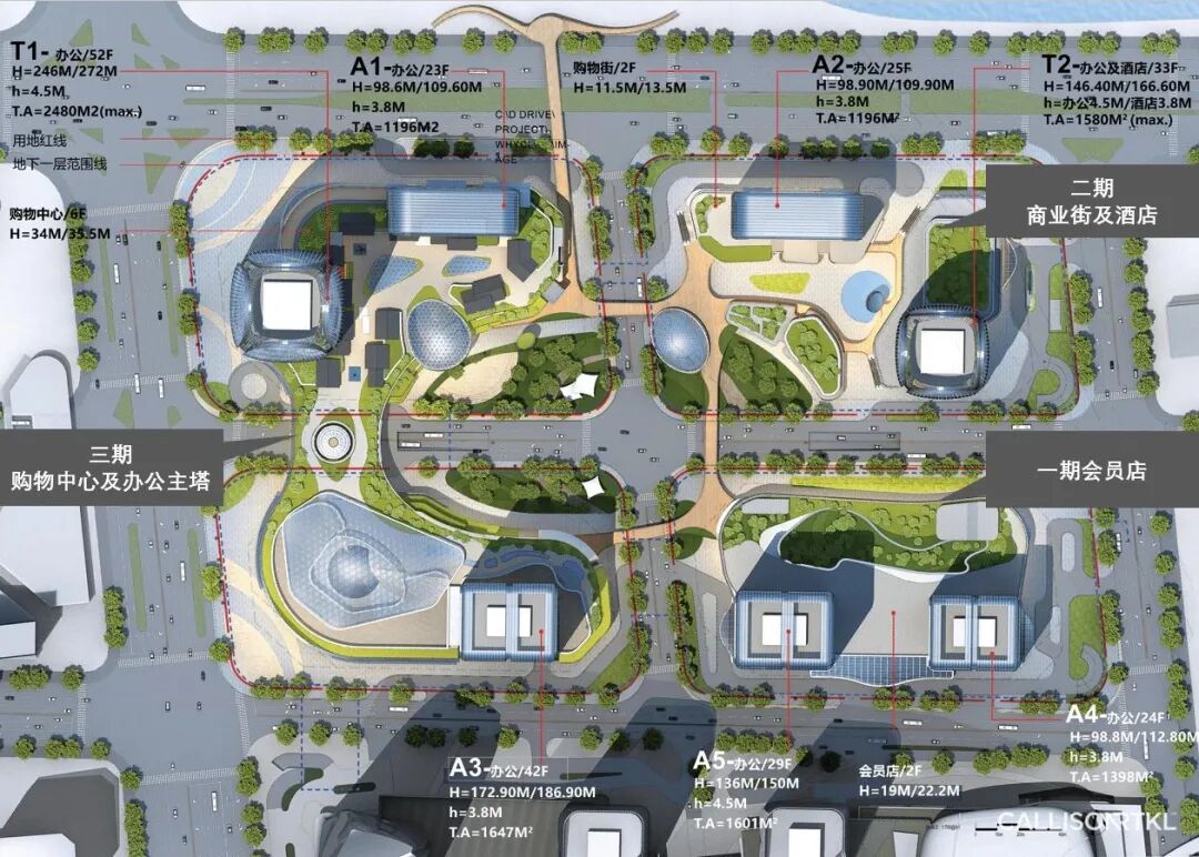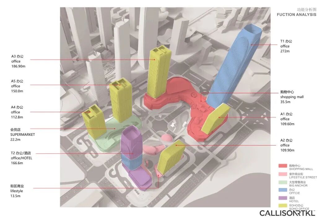 本案位于武汉市新中央商务区,其主要业态为办公、酒店、SOHO、购物中心、商业街及会员店;其中,办公主塔楼高270米,购物中心规模约10万平方米。