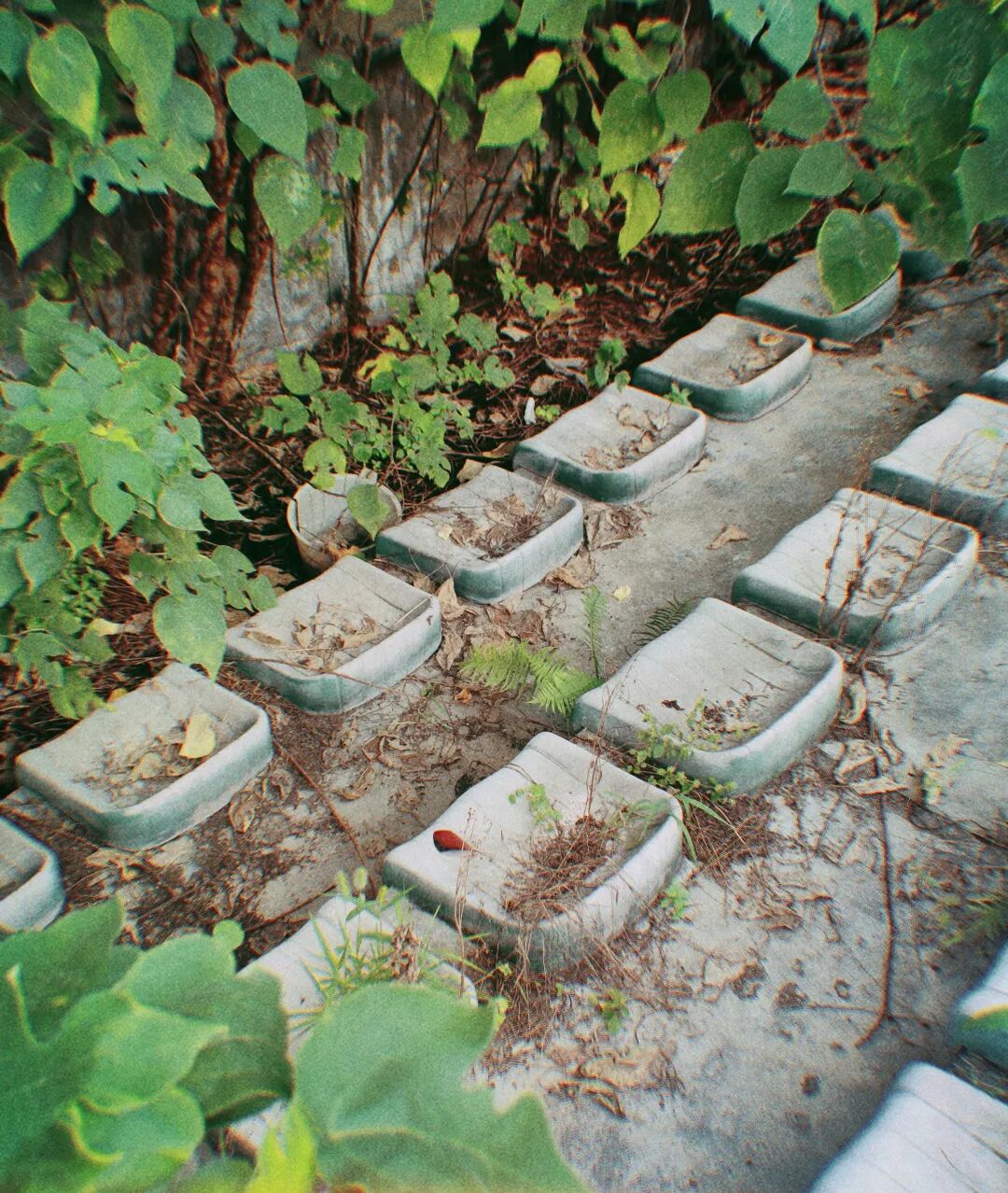 观众席上已长满杂草,破洞的蓝色塑料座椅上摆着一盆盆还未售出的植物。为了省电商铺里面一般不会开灯,从外围向里望,简陋的塑料棚下并排着繁茂拥簇的花枝与肥厚的叶片。