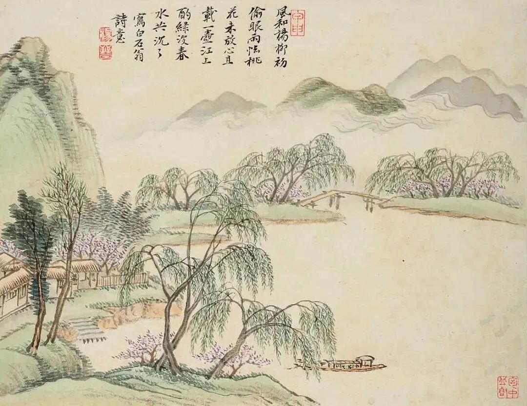 风和杨柳初偷眼,雨怯桃花未放心。且载一壶江上酌,绿波春水共沉沉。写白石翁诗意。