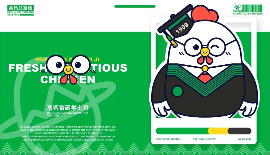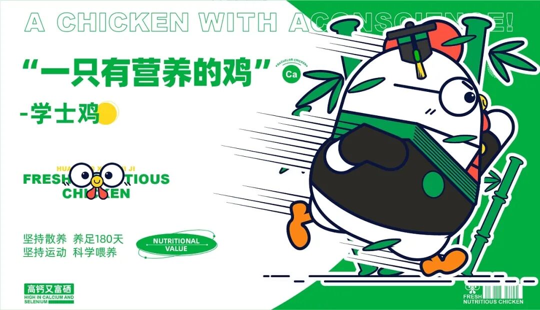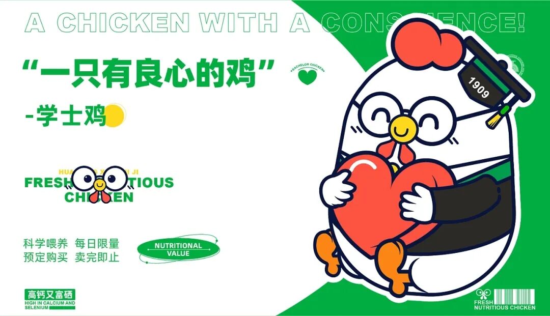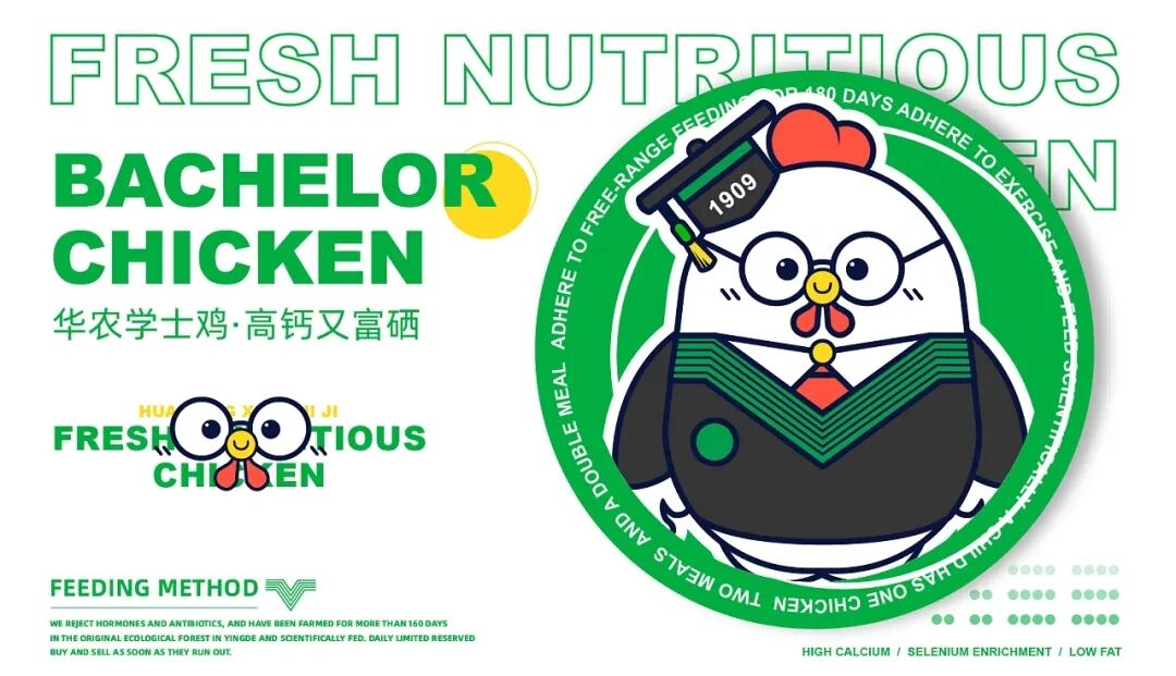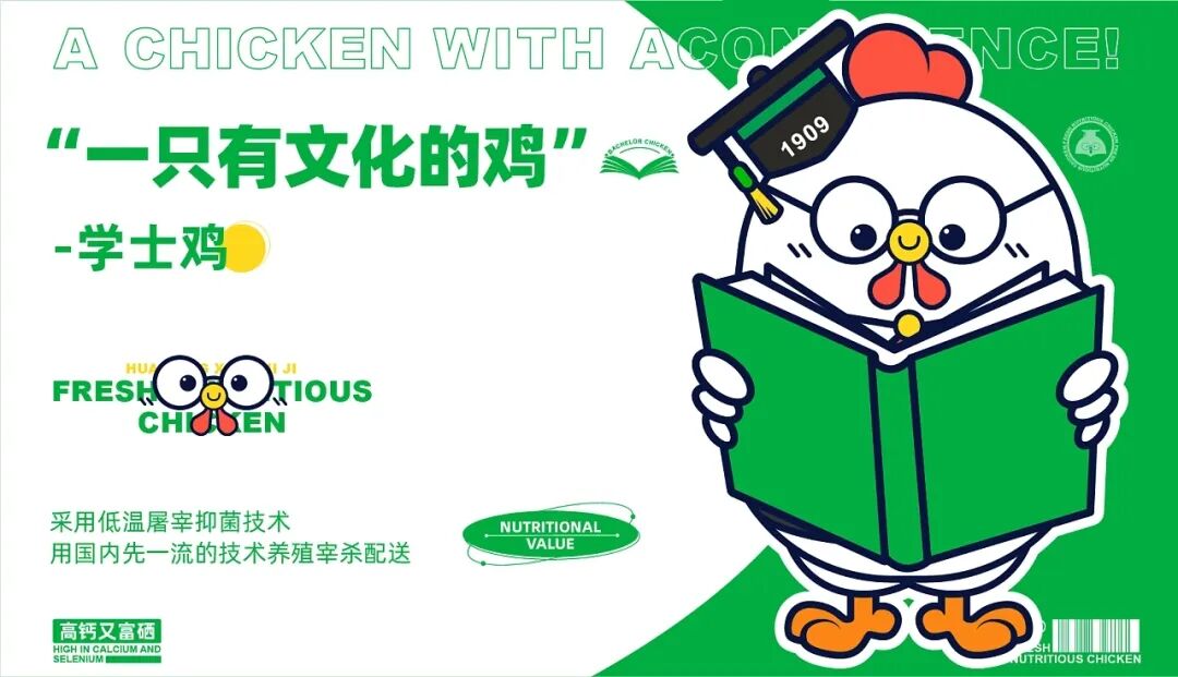 养鸡也能有这么多讲究?Bachelor Chicken-学士鸡品牌IP设计,旨在做“一只有良心的鸡” 、“一只有文化的鸡”和“一只有营养的鸡” ,并由中国双一流华高校团队专业养殖,在英德原生态竹林养殖160天以上,科学喂养,让每只学士鸡都是高钙,富硒,低脂,比普通的鸡更有营养价值。