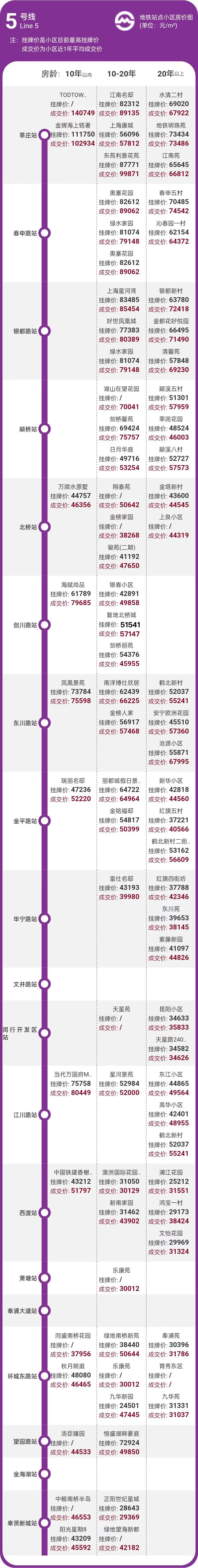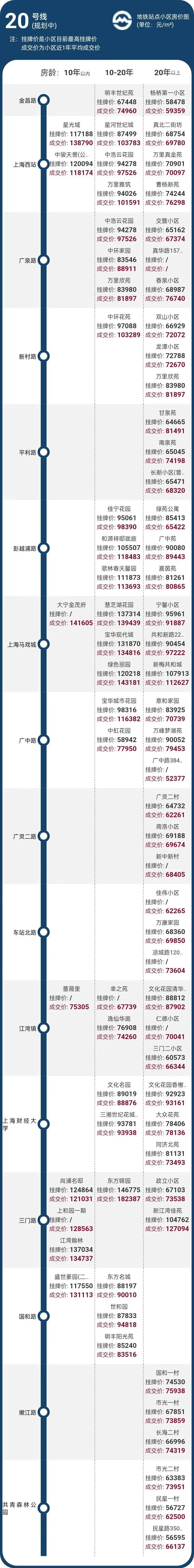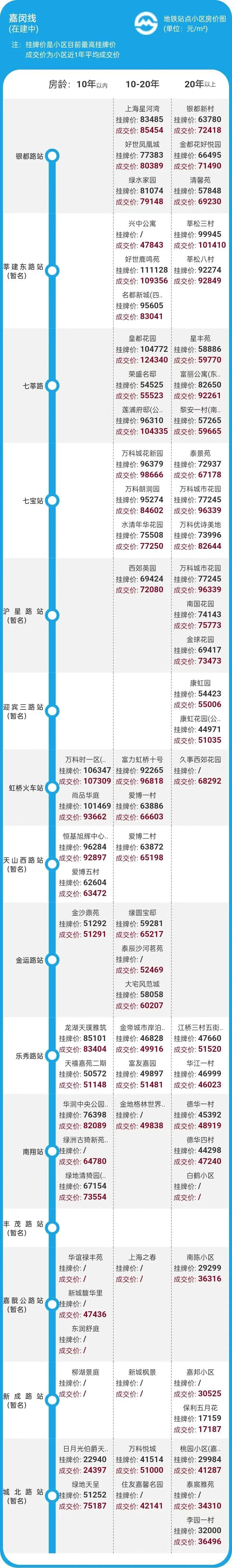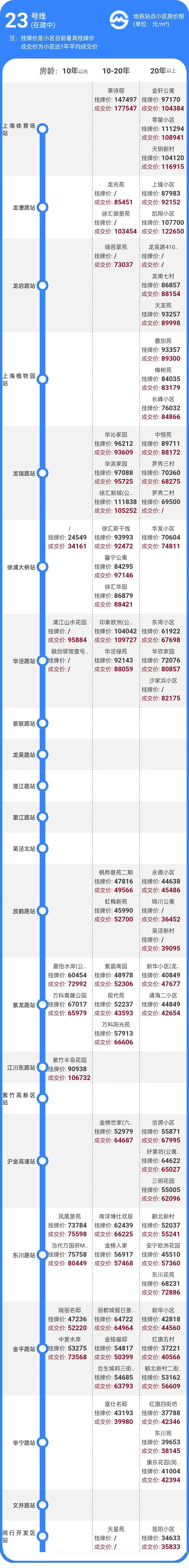 大势2023-11-14 “杨康”后,你家房子涨了还是跌了? 上海2023年1月 二手地铁房挂牌价&成交价 最新发布! ! ! ! ! ! ! ! ! ! ! ! ! ! ! ! ! ! ! ! ! ! ! ! ! ! ! ! ! ! ! ! ! ! ! 一起来看看您心仪的地铁房价值几何吧~ 1号线是上海最典型的南北走向线路。 线路由南到北穿过闵行莘庄、徐家汇、黄浦人民广场、新静安大宁、宝山共康共富、宝山杨行等板块。 2号线是上海最典型的东西走向线路。 起于徐泾东站,途经浦东新区、黄浦区、静安区、长宁区、闵行区、青浦区,横贯上海市区浦江两岸,止于浦东国际机场站。 3号线是南北走向线路。 南起徐汇区上海南站,沿途长宁区、普陀区、虹口区,北达宝山区江杨北路站。 4号线是内环沿线的环线。 南起徐汇区宜山路站,沿途徐汇区、黄浦区、浦东新区、静安区、普陀区、长宁区、杨浦区和虹口区,最终回到徐汇区宜山路站。 5号线是南北走向线路。 线路主线北起闵行区莘庄站,途经春申、颛桥、老闵行、西渡、南桥,终点止于奉贤区奉贤新城站。 支线东起闵行区东川路站,西至闵行区闵行开发区站。 6号线是东北-西南走向线路。 北起浦东新区港城路站,途径外高桥、森兰、金桥、源深洋泾、三林等区域,南至浦东新区东方体育中心站。 7号线是呈西北-东南走向线路。 北起宝山区美兰湖站,途经上海大学、大华、长寿路、静安寺、常熟路、徐汇滨江、世博南北两岸、花木北蔡等区域,终点止于浦东新区花木路站。 8号线是呈东北-西南走向线路。 东北起自杨浦区市光路站,途经杨浦区、虹口区、静安区、黄浦区,浦东新区,终点止于闵行区沈杜公路站。 浦江线往往被视为8号线延伸线,大致呈南北走向,起于沈杜公路站,途经闵行浦江镇,止于汇臻路站。 9号线呈“东北-西南”走向线路。 西南起于松江区松江南站,途经松江新城、七宝、漕河泾开发区、徐家汇、陆家嘴、世纪大道、金桥、曹路等多个重要区域。 10号线呈“西-东北”走向线路。 主线西起闵行区虹桥火车站,途经长宁区、徐汇区、黄浦区、静安区、虹口区,终点止于杨浦区新江湾城站,北段二期新江湾城站-基隆路站,经过杨浦区、浦东新区。 支线西起闵行区航中路站,终点止于长宁区龙溪路站,线路连接了上海市东北地区、中心城核心区、城市西南地区。 11号线呈“西北—东南”走向线路。 主线起自嘉定区嘉定北站,途经普陀区、长宁区、徐汇区,终点止于浦东新区迪士尼站。 支线西起昆山市花桥站,终点止于嘉定区嘉定新城站。 12号线是呈东西走向线路。 西起闵行区七莘路站,途经徐汇区、黄浦区、静安区、虹口区、杨浦区、浦东新区,终点止于浦东新区金海路站,串联上海西部与东北部。 13号线呈“西北—东南”走向线路。 西起嘉定区金运路站,途经普陀区、静安区,黄浦区、浦东新区,终点止于浦东张江路站。 13号线西延伸工程(联友路—诸光路)已开工,与规划地铁25号线共线,线路途经国家会展中心(上海)、徐泾镇、华漕镇等。 14号线是呈东西向的线路。 西起嘉定区封浜站,途经嘉定区、普陀区、静安区、黄浦区、浦东新区,东至浦东新区桂桥路站,是联系上海西北部和上海中心城区的便捷通道。 15号线是呈南北向线路。 北起宝山区顾村公园站,途经普陀区、长宁区、徐汇区,南至闵行区紫竹高新区站。 16号线是呈南北向线路。 全程位于上海市浦东新区境内,北起浦东中心区域,串联周浦、康桥、航头、新场以及惠南老城区,南接临港新城。 17号线是呈东西向的线路。 东起虹桥火车站,途经闵行区、青浦区,西至青浦区东方绿舟站。 18号线是呈南北走向的线路。 一期工程已全部通车,北起宝山区长江南路站,途经杨浦区,南至浦东新区航头站。 二期工程已于21年6月28日已开工建设,线路起于宝山区长江南路站,沿长江南路—郁江巷路—呼兰路走行至大康路。 地铁20号线是一条北部的切向线。 路线起于普陀区的金昌路站,途经普陀、宝山、静安以及杨浦等区,一期终点站止于杨浦区共青森林公园站。 这条北中环地铁串联起桃浦、真如副中心、大宁、新江湾、森兰、外高桥自贸区等中心城北部重点发展区域。 21号线是上海新一轮轨交规划(2017~2025)中的一条新线,串联起浦东多条地铁的南北线路,已经开工建设。 线路途径吴淞国际邮轮码头,吴淞客运中心,外高桥自贸区、金桥、张江、迪士尼,浦东国际机场等板块。 21号线一期工程增加东延伸段,主要沿川南奉公路走行,终至浦东综合交通枢纽(地区)。 23号线是一条南北向西走向的地铁线路。 线路起自闵行开发区,终于上海体育场,途经闵行区和徐汇区。串联了闵行开发区、紫竹高新区、吴泾转型地区、徐汇滨江地区等重要区域。 嘉闵线呈现南北走向。 北起11号线嘉定北站,与11号线换乘,途经嘉定工业区、嘉定老城、南翔、虹桥商务区、七宝直至莘庄、闵行春申,闵行开发区。 该线路已于2021年6月28日开工建设,设站15座,站点不多,长44公里,未来仍有北延伸。 机场联络线是东西向市域线。 线路由闵行区的虹桥火车站至浦东新区上海东交通枢纽的上海东站站。 途经主要区域有虹桥商务区、七宝、梅陇、华泾、三林、张江科学城、国际旅游度假区、浦东国际机场、铁路上海东站等。 崇明线是一条快速连接崇明区和上海中心城区的市域线,途经浦东新区和崇明区2个行政区。 该线起自浦东新区金吉路站,总体沿申江