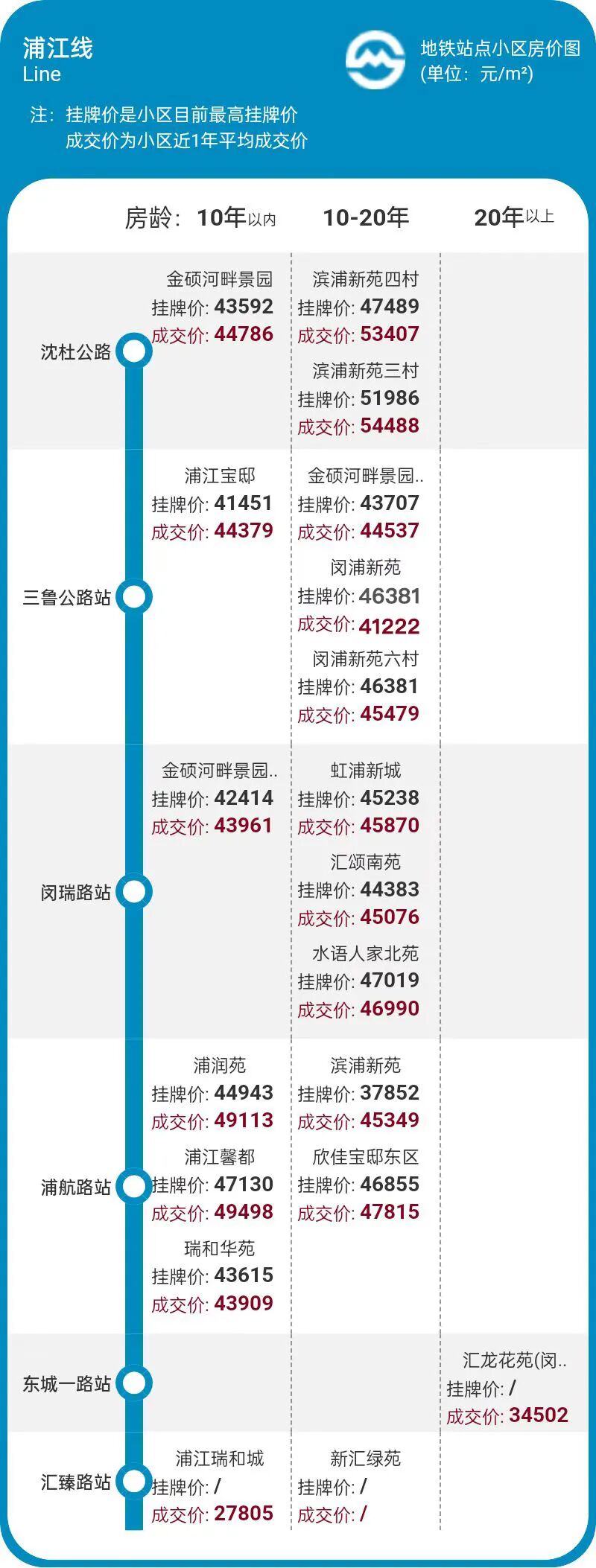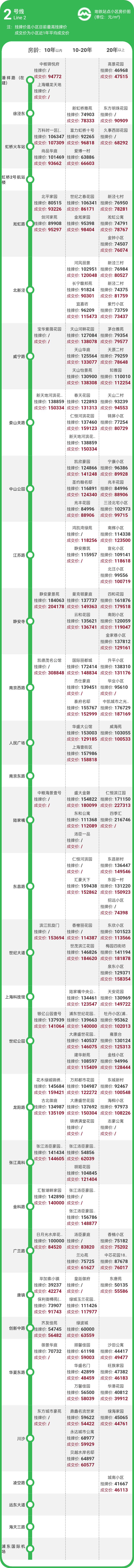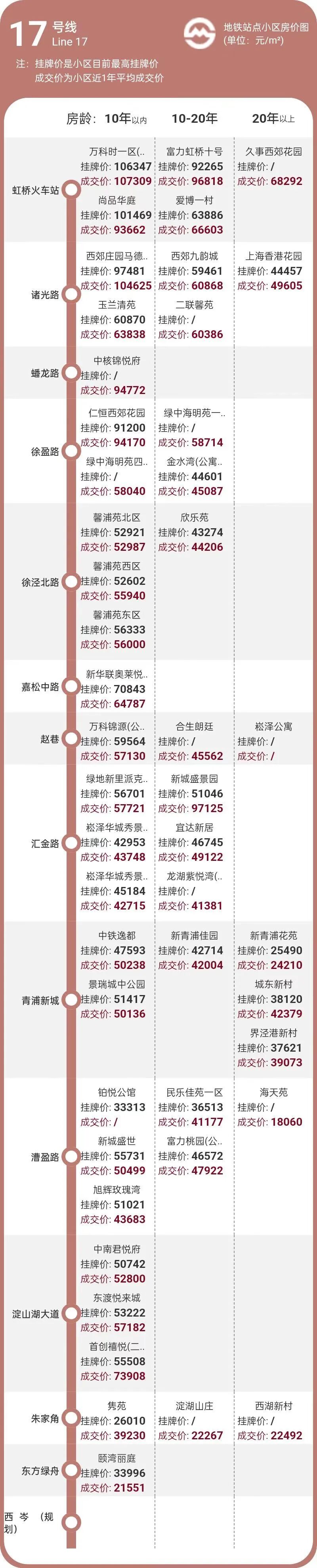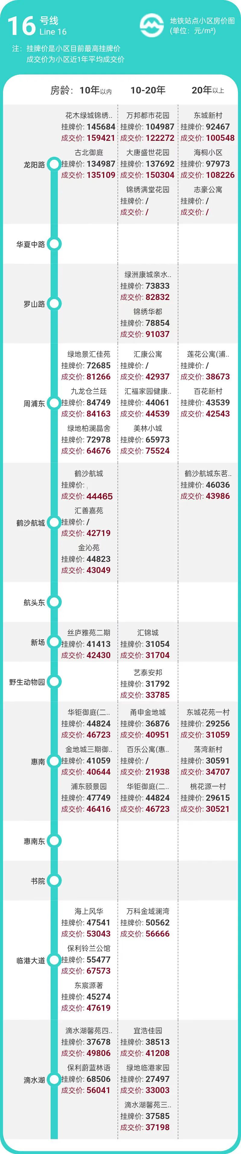 大势2023-11-14 “杨康”后,你家房子涨了还是跌了? 上海2023年1月 二手地铁房挂牌价&成交价 最新发布! ! ! ! ! ! ! ! ! ! ! ! ! ! ! ! ! ! ! ! ! ! ! ! ! ! ! ! ! ! ! ! ! ! ! 一起来看看您心仪的地铁房价值几何吧~ 1号线是上海最典型的南北走向线路。 线路由南到北穿过闵行莘庄、徐家汇、黄浦人民广场、新静安大宁、宝山共康共富、宝山杨行等板块。 2号线是上海最典型的东西走向线路。 起于徐泾东站,途经浦东新区、黄浦区、静安区、长宁区、闵行区、青浦区,横贯上海市区浦江两岸,止于浦东国际机场站。 3号线是南北走向线路。 南起徐汇区上海南站,沿途长宁区、普陀区、虹口区,北达宝山区江杨北路站。 4号线是内环沿线的环线。 南起徐汇区宜山路站,沿途徐汇区、黄浦区、浦东新区、静安区、普陀区、长宁区、杨浦区和虹口区,最终回到徐汇区宜山路站。 5号线是南北走向线路。 线路主线北起闵行区莘庄站,途经春申、颛桥、老闵行、西渡、南桥,终点止于奉贤区奉贤新城站。 支线东起闵行区东川路站,西至闵行区闵行开发区站。 6号线是东北-西南走向线路。 北起浦东新区港城路站,途径外高桥、森兰、金桥、源深洋泾、三林等区域,南至浦东新区东方体育中心站。 7号线是呈西北-东南走向线路。 北起宝山区美兰湖站,途经上海大学、大华、长寿路、静安寺、常熟路、徐汇滨江、世博南北两岸、花木北蔡等区域,终点止于浦东新区花木路站。 8号线是呈东北-西南走向线路。 东北起自杨浦区市光路站,途经杨浦区、虹口区、静安区、黄浦区,浦东新区,终点止于闵行区沈杜公路站。 浦江线往往被视为8号线延伸线,大致呈南北走向,起于沈杜公路站,途经闵行浦江镇,止于汇臻路站。 9号线呈“东北-西南”走向线路。 西南起于松江区松江南站,途经松江新城、七宝、漕河泾开发区、徐家汇、陆家嘴、世纪大道、金桥、曹路等多个重要区域。 10号线呈“西-东北”走向线路。 主线西起闵行区虹桥火车站,途经长宁区、徐汇区、黄浦区、静安区、虹口区,终点止于杨浦区新江湾城站,北段二期新江湾城站-基隆路站,经过杨浦区、浦东新区。 支线西起闵行区航中路站,终点止于长宁区龙溪路站,线路连接了上海市东北地区、中心城核心区、城市西南地区。 11号线呈“西北—东南”走向线路。 主线起自嘉定区嘉定北站,途经普陀区、长宁区、徐汇区,终点止于浦东新区迪士尼站。 支线西起昆山市花桥站,终点止于嘉定区嘉定新城站。 12号线是呈东西走向线路。 西起闵行区七莘路站,途经徐汇区、黄浦区、静安区、虹口区、杨浦区、浦东新区,终点止于浦东新区金海路站,串联上海西部与东北部。 13号线呈“西北—东南”走向线路。 西起嘉定区金运路站,途经普陀区、静安区,黄浦区、浦东新区,终点止于浦东张江路站。 13号线西延伸工程(联友路—诸光路)已开工,与规划地铁25号线共线,线路途经国家会展中心(上海)、徐泾镇、华漕镇等。 14号线是呈东西向的线路。 西起嘉定区封浜站,途经嘉定区、普陀区、静安区、黄浦区、浦东新区,东至浦东新区桂桥路站,是联系上海西北部和上海中心城区的便捷通道。 15号线是呈南北向线路。 北起宝山区顾村公园站,途经普陀区、长宁区、徐汇区,南至闵行区紫竹高新区站。 16号线是呈南北向线路。 全程位于上海市浦东新区境内,北起浦东中心区域,串联周浦、康桥、航头、新场以及惠南老城区,南接临港新城。 17号线是呈东西向的线路。 东起虹桥火车站,途经闵行区、青浦区,西至青浦区东方绿舟站。 18号线是呈南北走向的线路。 一期工程已全部通车,北起宝山区长江南路站,途经杨浦区,南至浦东新区航头站。 二期工程已于21年6月28日已开工建设,线路起于宝山区长江南路站,沿长江南路—郁江巷路—呼兰路走行至大康路。 地铁20号线是一条北部的切向线。 路线起于普陀区的金昌路站,途经普陀、宝山、静安以及杨浦等区,一期终点站止于杨浦区共青森林公园站。 这条北中环地铁串联起桃浦、真如副中心、大宁、新江湾、森兰、外高桥自贸区等中心城北部重点发展区域。 21号线是上海新一轮轨交规划(2017~2025)中的一条新线,串联起浦东多条地铁的南北线路,已经开工建设。 线路途径吴淞国际邮轮码头,吴淞客运中心,外高桥自贸区、金桥、张江、迪士尼,浦东国际机场等板块。 21号线一期工程增加东延伸段,主要沿川南奉公路走行,终至浦东综合交通枢纽(地区)。 23号线是一条南北向西走向的地铁线路。 线路起自闵行开发区,终于上海体育场,途经闵行区和徐汇区。串联了闵行开发区、紫竹高新区、吴泾转型地区、徐汇滨江地区等重要区域。 嘉闵线呈现南北走向。 北起11号线嘉定北站,与11号线换乘,途经嘉定工业区、嘉定老城、南翔、虹桥商务区、七宝直至莘庄、闵行春申,闵行开发区。 该线路已于2021年6月28日开工建设,设站15座,站点不多,长44公里,未来仍有北延伸。 机场联络线是东西向市域线。 线路由闵行区的虹桥火车站至浦东新区上海东交通枢纽的上海东站站。 途经主要区域有虹桥商务区、七宝、梅陇、华泾、三林、张江科学城、国际旅游度假区、浦东国际机场、铁路上海东站等。 崇明线是一条快速连接崇明区和上海中心城区的市域线,途经浦东新区和崇明区2个行政区。 该线起自浦东新区金吉路站,总体沿申江