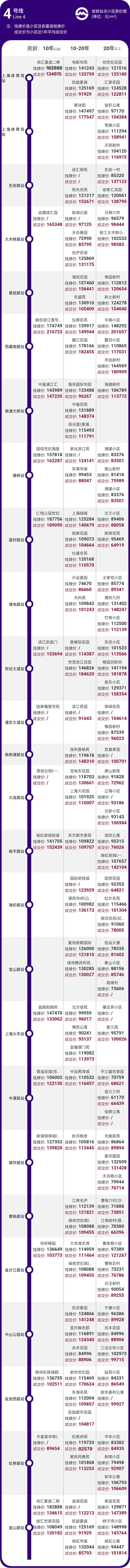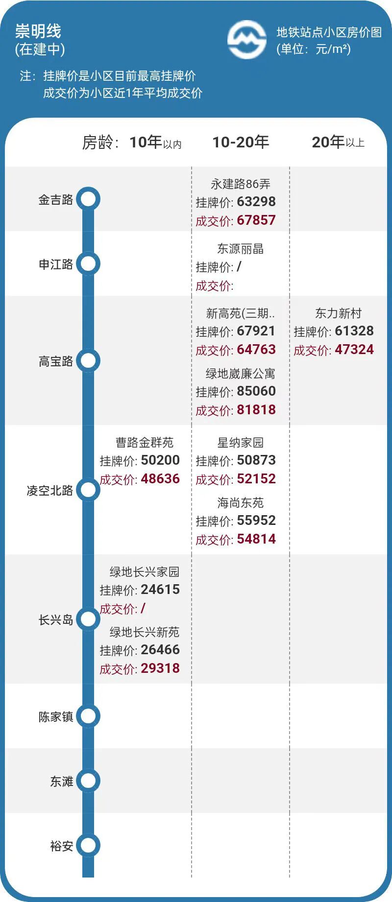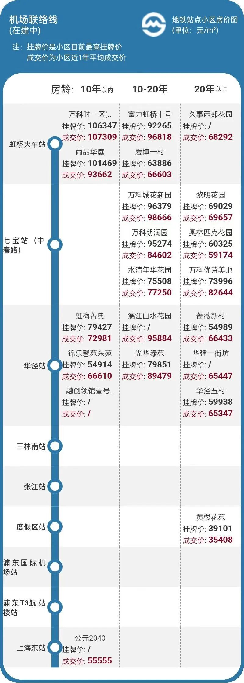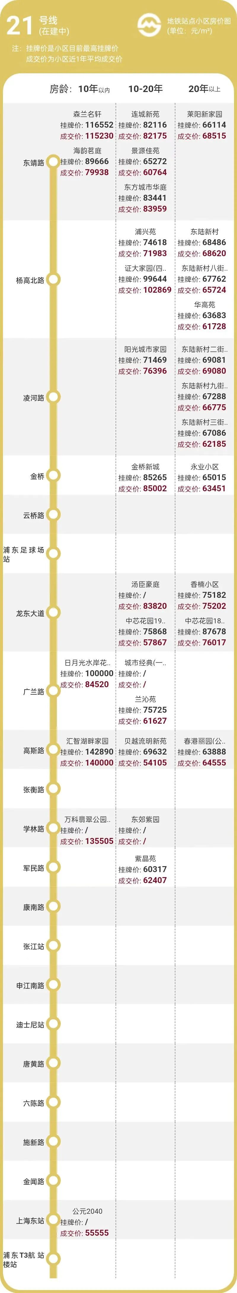 大势2023-11-14 “杨康”后,你家房子涨了还是跌了? 上海2023年1月 二手地铁房挂牌价&成交价 最新发布! ! ! ! ! ! ! ! ! ! ! ! ! ! ! ! ! ! ! ! ! ! ! ! ! ! ! ! ! ! ! ! ! ! ! 一起来看看您心仪的地铁房价值几何吧~ 1号线是上海最典型的南北走向线路。 线路由南到北穿过闵行莘庄、徐家汇、黄浦人民广场、新静安大宁、宝山共康共富、宝山杨行等板块。 2号线是上海最典型的东西走向线路。 起于徐泾东站,途经浦东新区、黄浦区、静安区、长宁区、闵行区、青浦区,横贯上海市区浦江两岸,止于浦东国际机场站。 3号线是南北走向线路。 南起徐汇区上海南站,沿途长宁区、普陀区、虹口区,北达宝山区江杨北路站。 4号线是内环沿线的环线。 南起徐汇区宜山路站,沿途徐汇区、黄浦区、浦东新区、静安区、普陀区、长宁区、杨浦区和虹口区,最终回到徐汇区宜山路站。 5号线是南北走向线路。 线路主线北起闵行区莘庄站,途经春申、颛桥、老闵行、西渡、南桥,终点止于奉贤区奉贤新城站。 支线东起闵行区东川路站,西至闵行区闵行开发区站。 6号线是东北-西南走向线路。 北起浦东新区港城路站,途径外高桥、森兰、金桥、源深洋泾、三林等区域,南至浦东新区东方体育中心站。 7号线是呈西北-东南走向线路。 北起宝山区美兰湖站,途经上海大学、大华、长寿路、静安寺、常熟路、徐汇滨江、世博南北两岸、花木北蔡等区域,终点止于浦东新区花木路站。 8号线是呈东北-西南走向线路。 东北起自杨浦区市光路站,途经杨浦区、虹口区、静安区、黄浦区,浦东新区,终点止于闵行区沈杜公路站。 浦江线往往被视为8号线延伸线,大致呈南北走向,起于沈杜公路站,途经闵行浦江镇,止于汇臻路站。 9号线呈“东北-西南”走向线路。 西南起于松江区松江南站,途经松江新城、七宝、漕河泾开发区、徐家汇、陆家嘴、世纪大道、金桥、曹路等多个重要区域。 10号线呈“西-东北”走向线路。 主线西起闵行区虹桥火车站,途经长宁区、徐汇区、黄浦区、静安区、虹口区,终点止于杨浦区新江湾城站,北段二期新江湾城站-基隆路站,经过杨浦区、浦东新区。 支线西起闵行区航中路站,终点止于长宁区龙溪路站,线路连接了上海市东北地区、中心城核心区、城市西南地区。 11号线呈“西北—东南”走向线路。 主线起自嘉定区嘉定北站,途经普陀区、长宁区、徐汇区,终点止于浦东新区迪士尼站。 支线西起昆山市花桥站,终点止于嘉定区嘉定新城站。 12号线是呈东西走向线路。 西起闵行区七莘路站,途经徐汇区、黄浦区、静安区、虹口区、杨浦区、浦东新区,终点止于浦东新区金海路站,串联上海西部与东北部。 13号线呈“西北—东南”走向线路。 西起嘉定区金运路站,途经普陀区、静安区,黄浦区、浦东新区,终点止于浦东张江路站。 13号线西延伸工程(联友路—诸光路)已开工,与规划地铁25号线共线,线路途经国家会展中心(上海)、徐泾镇、华漕镇等。 14号线是呈东西向的线路。 西起嘉定区封浜站,途经嘉定区、普陀区、静安区、黄浦区、浦东新区,东至浦东新区桂桥路站,是联系上海西北部和上海中心城区的便捷通道。 15号线是呈南北向线路。 北起宝山区顾村公园站,途经普陀区、长宁区、徐汇区,南至闵行区紫竹高新区站。 16号线是呈南北向线路。 全程位于上海市浦东新区境内,北起浦东中心区域,串联周浦、康桥、航头、新场以及惠南老城区,南接临港新城。 17号线是呈东西向的线路。 东起虹桥火车站,途经闵行区、青浦区,西至青浦区东方绿舟站。 18号线是呈南北走向的线路。 一期工程已全部通车,北起宝山区长江南路站,途经杨浦区,南至浦东新区航头站。 二期工程已于21年6月28日已开工建设,线路起于宝山区长江南路站,沿长江南路—郁江巷路—呼兰路走行至大康路。 地铁20号线是一条北部的切向线。 路线起于普陀区的金昌路站,途经普陀、宝山、静安以及杨浦等区,一期终点站止于杨浦区共青森林公园站。 这条北中环地铁串联起桃浦、真如副中心、大宁、新江湾、森兰、外高桥自贸区等中心城北部重点发展区域。 21号线是上海新一轮轨交规划(2017~2025)中的一条新线,串联起浦东多条地铁的南北线路,已经开工建设。 线路途径吴淞国际邮轮码头,吴淞客运中心,外高桥自贸区、金桥、张江、迪士尼,浦东国际机场等板块。 21号线一期工程增加东延伸段,主要沿川南奉公路走行,终至浦东综合交通枢纽(地区)。 23号线是一条南北向西走向的地铁线路。 线路起自闵行开发区,终于上海体育场,途经闵行区和徐汇区。串联了闵行开发区、紫竹高新区、吴泾转型地区、徐汇滨江地区等重要区域。 嘉闵线呈现南北走向。 北起11号线嘉定北站,与11号线换乘,途经嘉定工业区、嘉定老城、南翔、虹桥商务区、七宝直至莘庄、闵行春申,闵行开发区。 该线路已于2021年6月28日开工建设,设站15座,站点不多,长44公里,未来仍有北延伸。 机场联络线是东西向市域线。 线路由闵行区的虹桥火车站至浦东新区上海东交通枢纽的上海东站站。 途经主要区域有虹桥商务区、七宝、梅陇、华泾、三林、张江科学城、国际旅游度假区、浦东国际机场、铁路上海东站等。 崇明线是一条快速连接崇明区和上海中心城区的市域线,途经浦东新区和崇明区2个行政区。 该线起自浦东新区金吉路站,总体沿申江