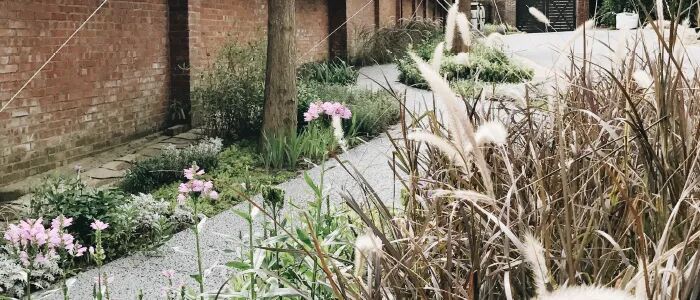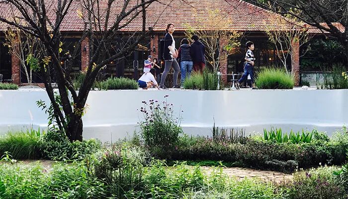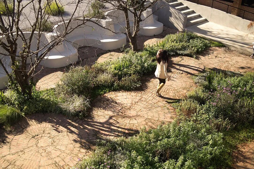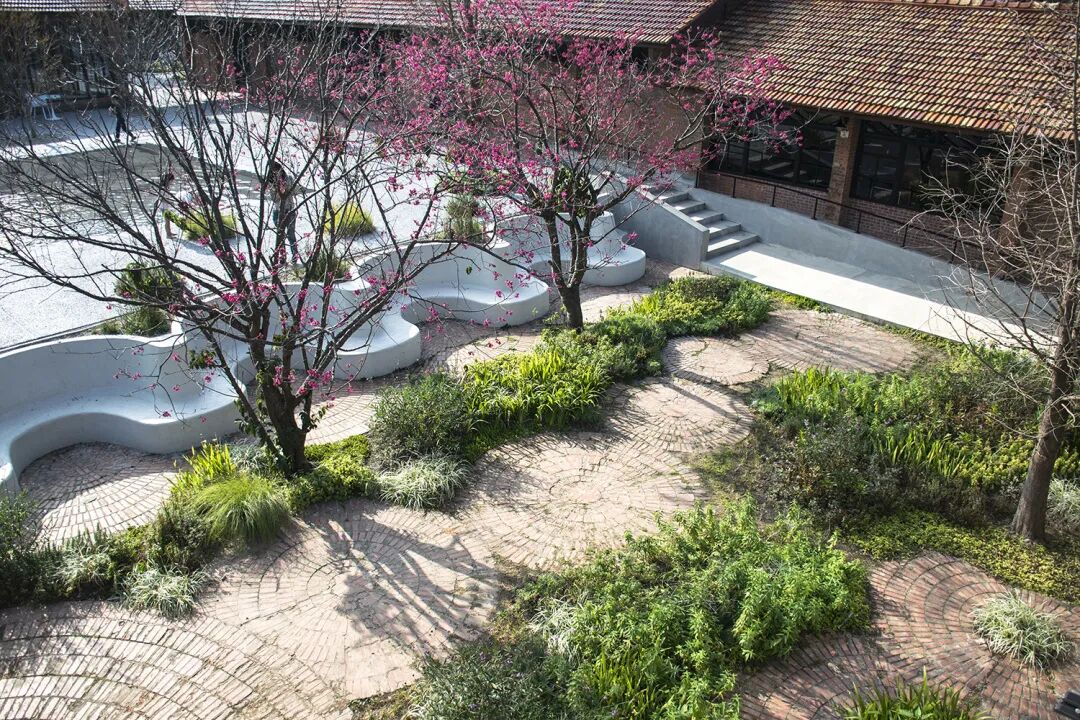 樱花树和本土灌木从红砖表面冒出来,弯曲的长椅看起来就像公共艺术出现在地貌中。
