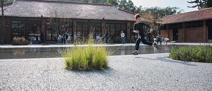 There are plenty of indoor and outdoor spaces for exhibitions and performances, we transform the outdoor swimming pool into 8 cm depth water feature which kids can use as a playground or water theme park, while the central pathway serves as a catwalk for shows and when we dry the water then it becomes a plaza for various activities.