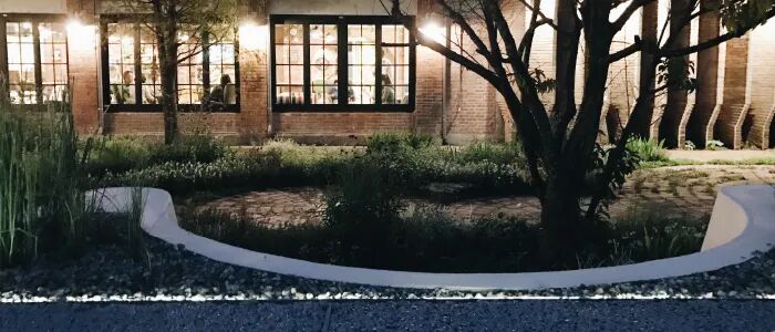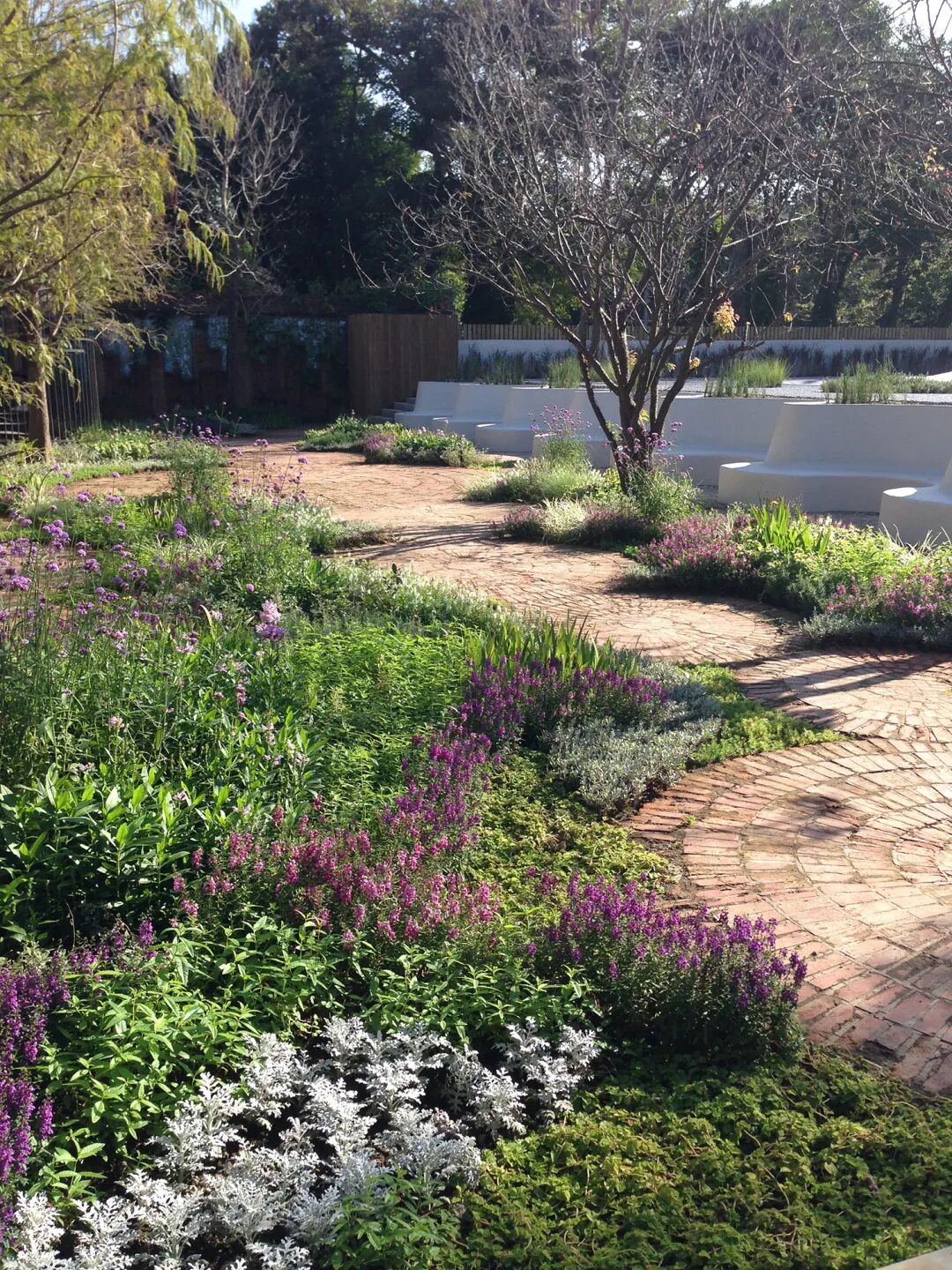 Cherry trees and indigenous species shrubs emerging from the red-brick surface and the curved bench look just like public art emerge into the landform.