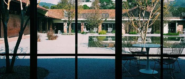 一个中央庭院,0.1英亩的池塘(曾经是3.4米深的游泳池)为场地内的主要空间创造了一个视觉点,水景发挥了镜子的作用,反映了周围的山景。因此树木似乎从水底生长出来,浮现在水面上,成为生命和能量的宏伟象征。