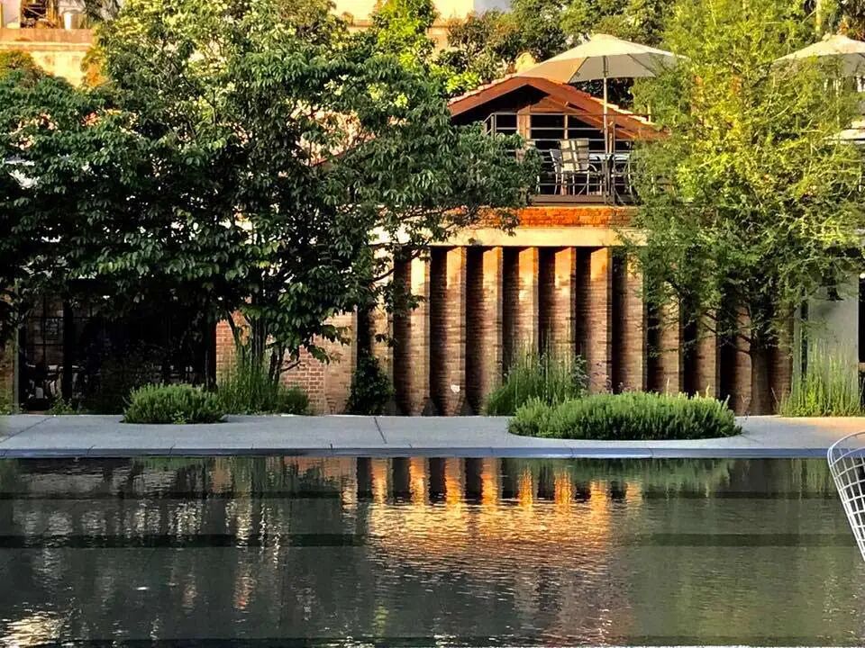 A central court yard, 0.1-acre pond (used to be 3.4 m deep swimming pool) creates a visual point for the main spaces within the site and the water feature play the role as a mirror which reflect the surrounding mountain scene so the trees seem to grow from beneath the water, emerging above the surface as majestic symbols of life and energy.