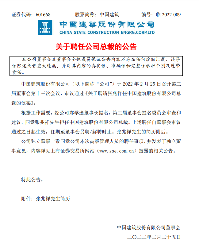 中国建筑股份有限公司(以下简称“公司”)于2022年2月25日召开第三届董事会第十三次会议,审议通过《关于聘请张兆祥任中国建筑股份有限公司总裁的议案》。