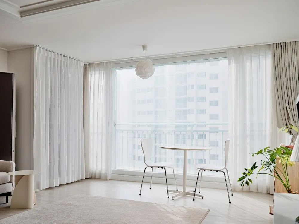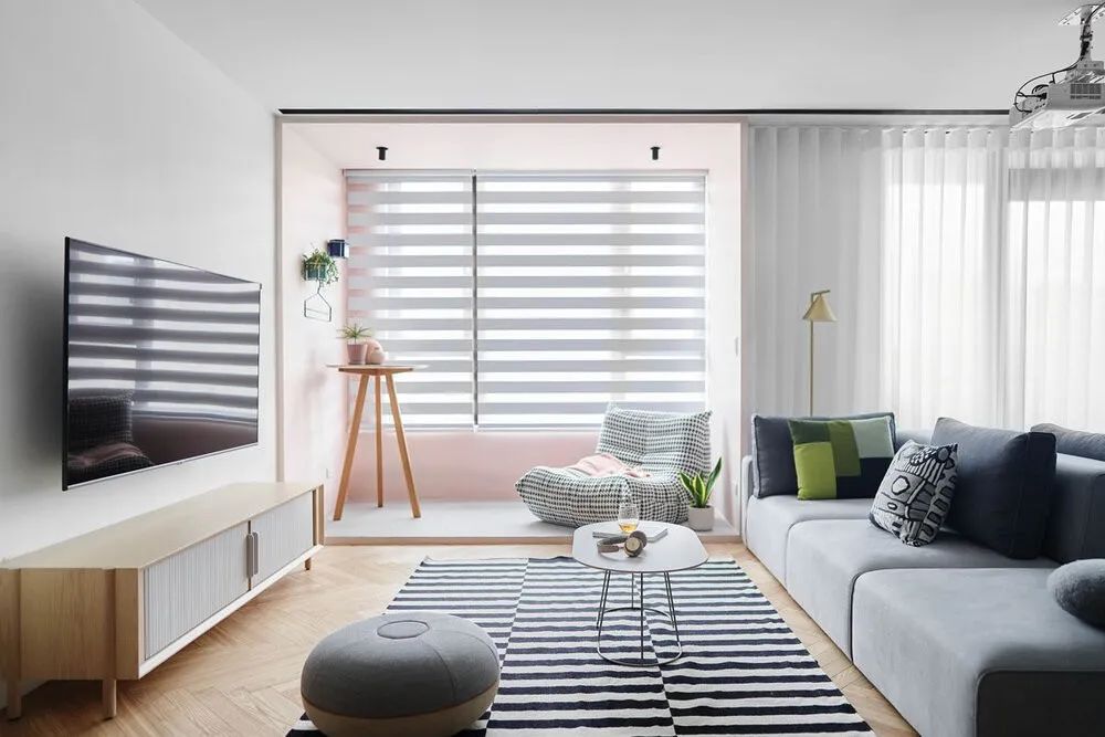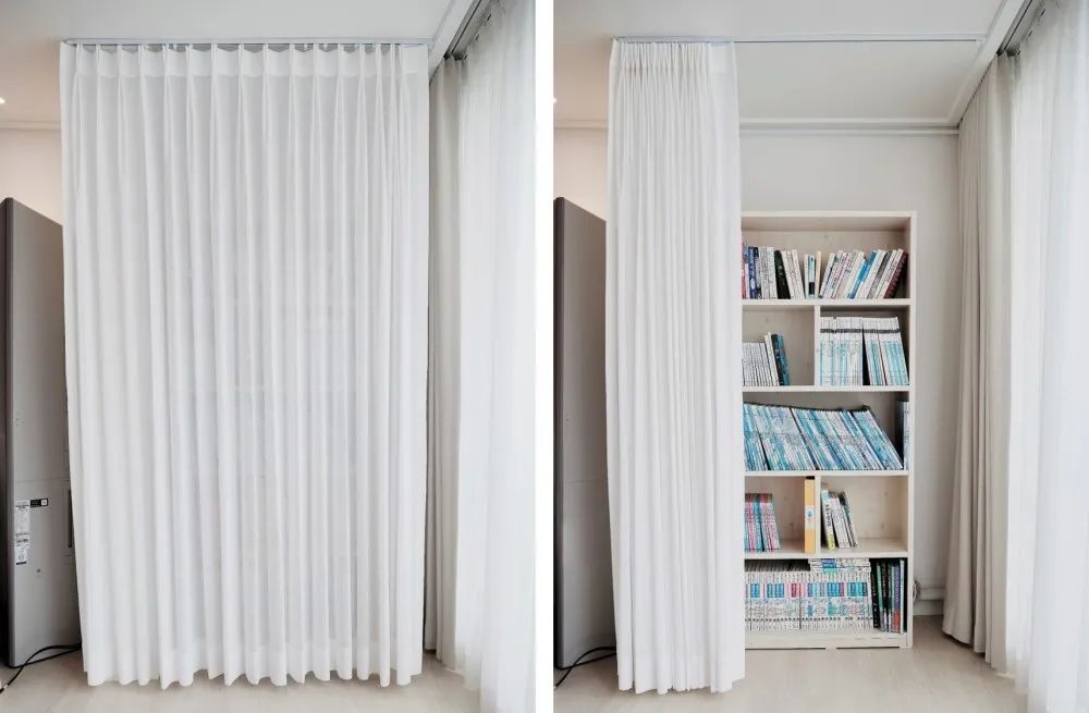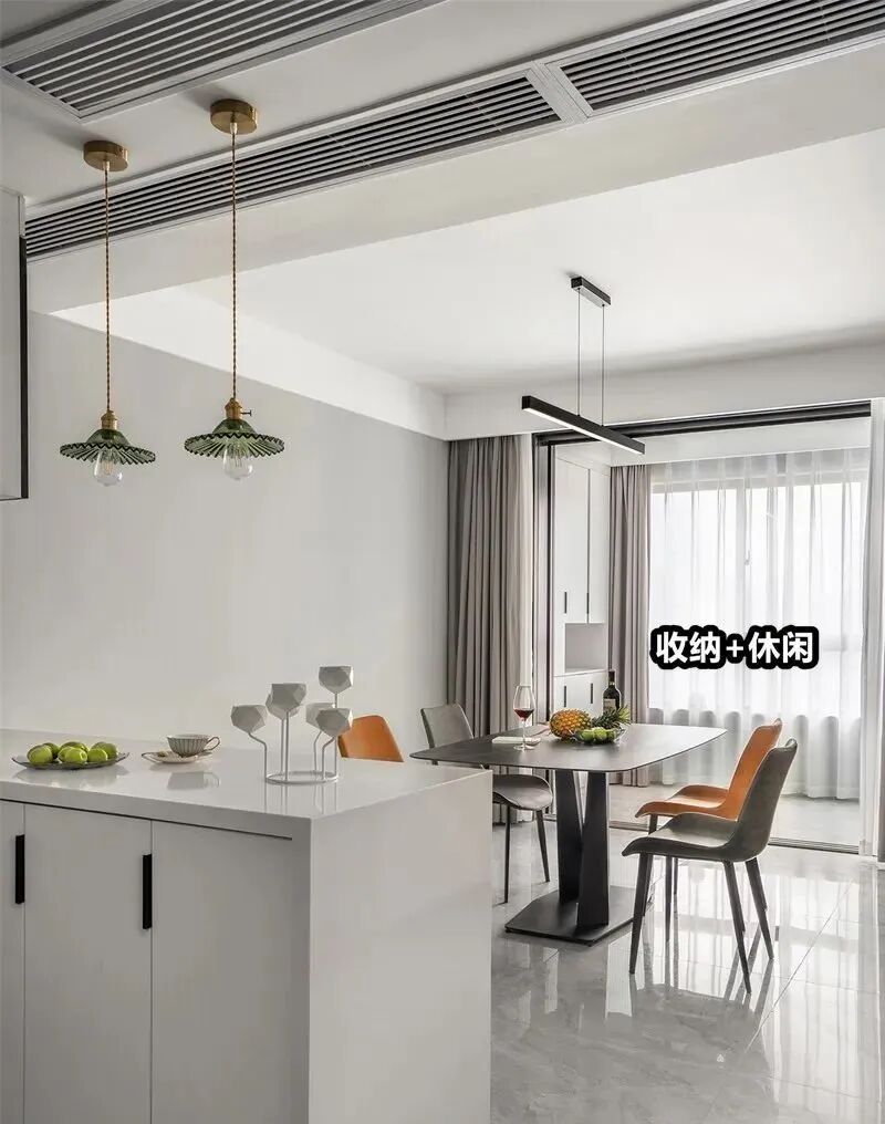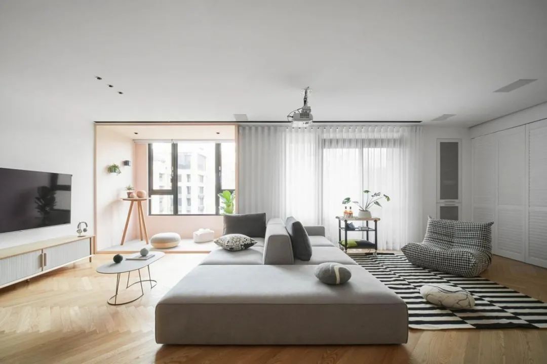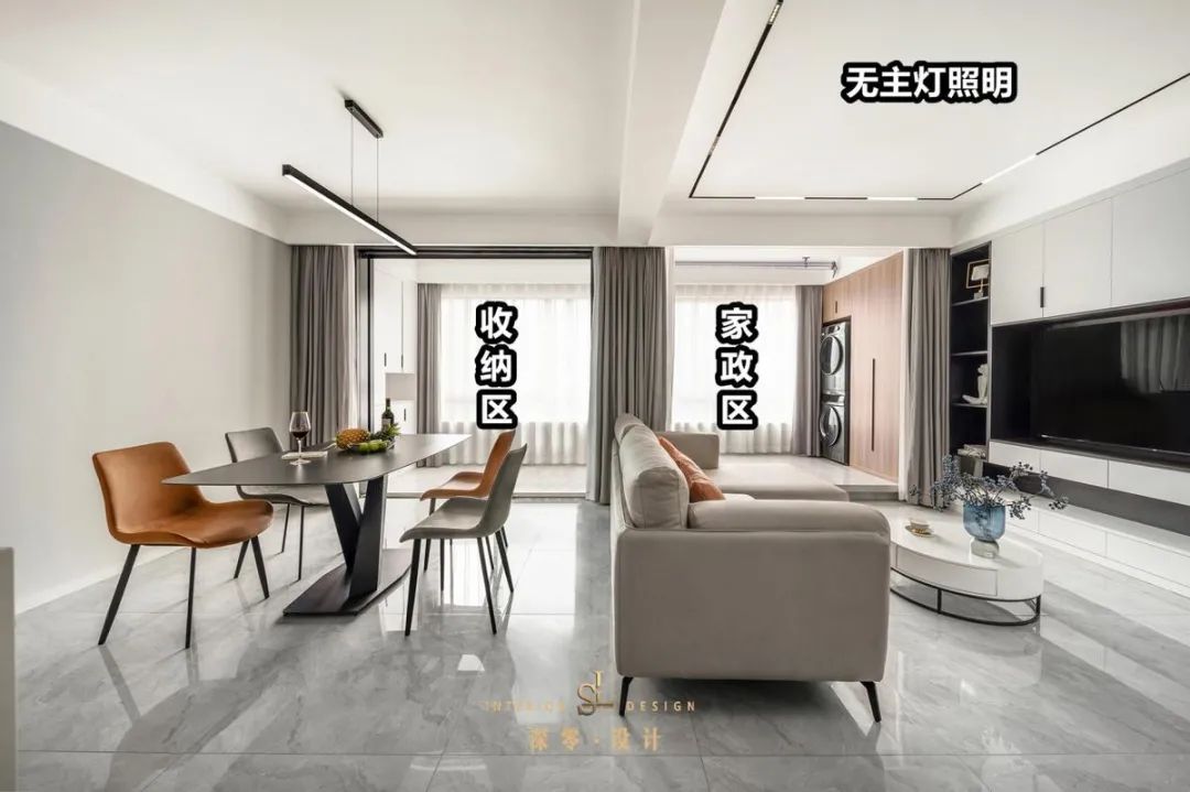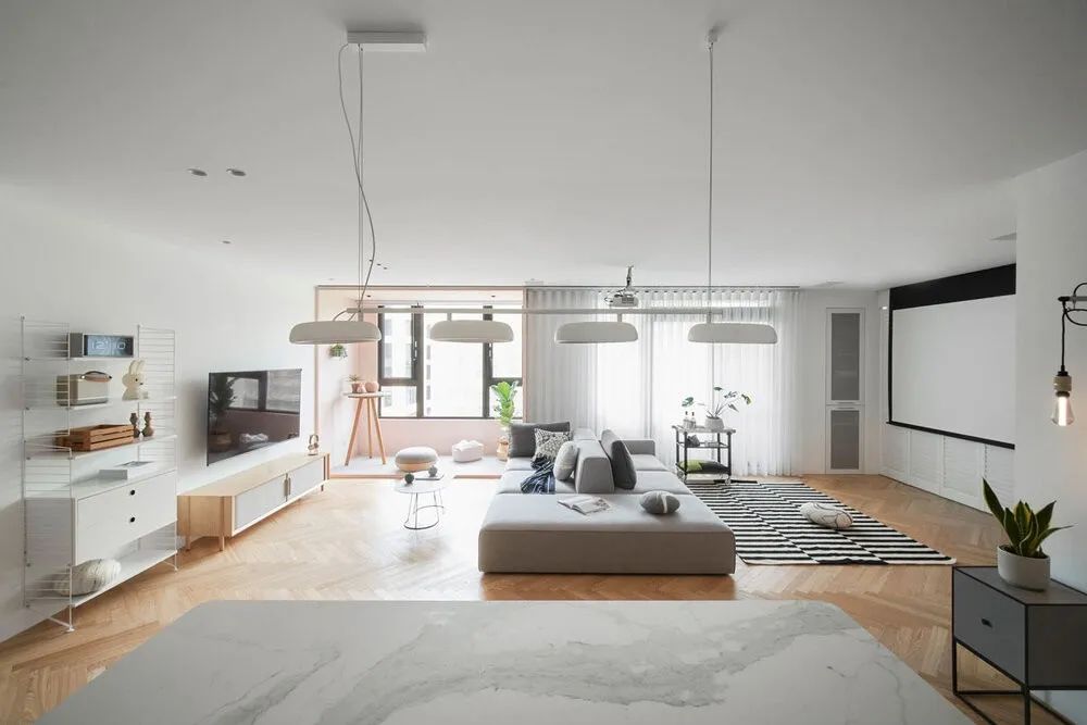 大横厅沙发不靠墙,是大部分家庭的选择,但他家别具一格选择了双面的沙发,同时满足了两侧的落座,一半做正常的客厅布局,另外一半做家庭观影区,舍弃茶几,还能方便小孩等在这儿玩乐。