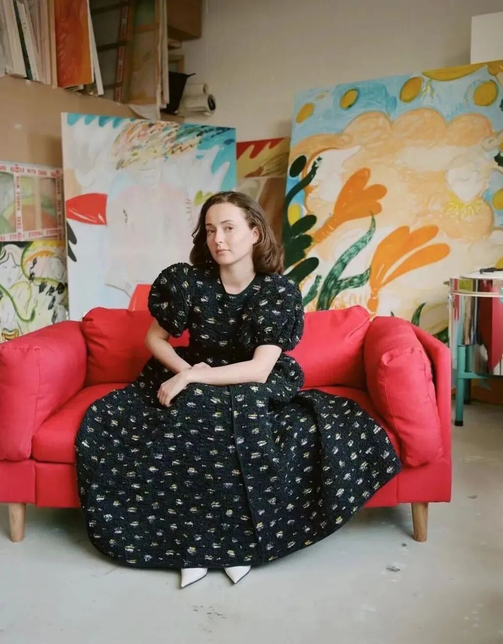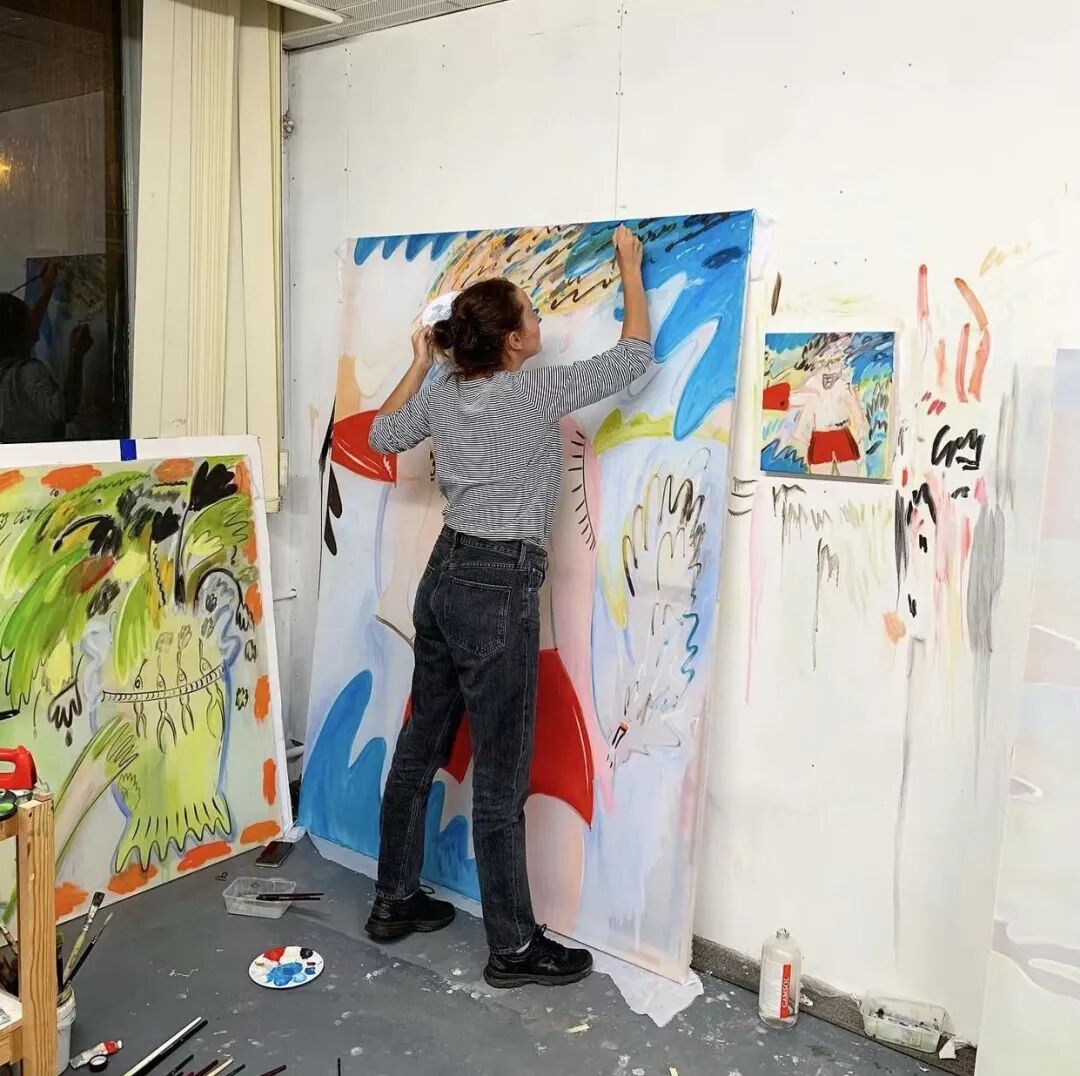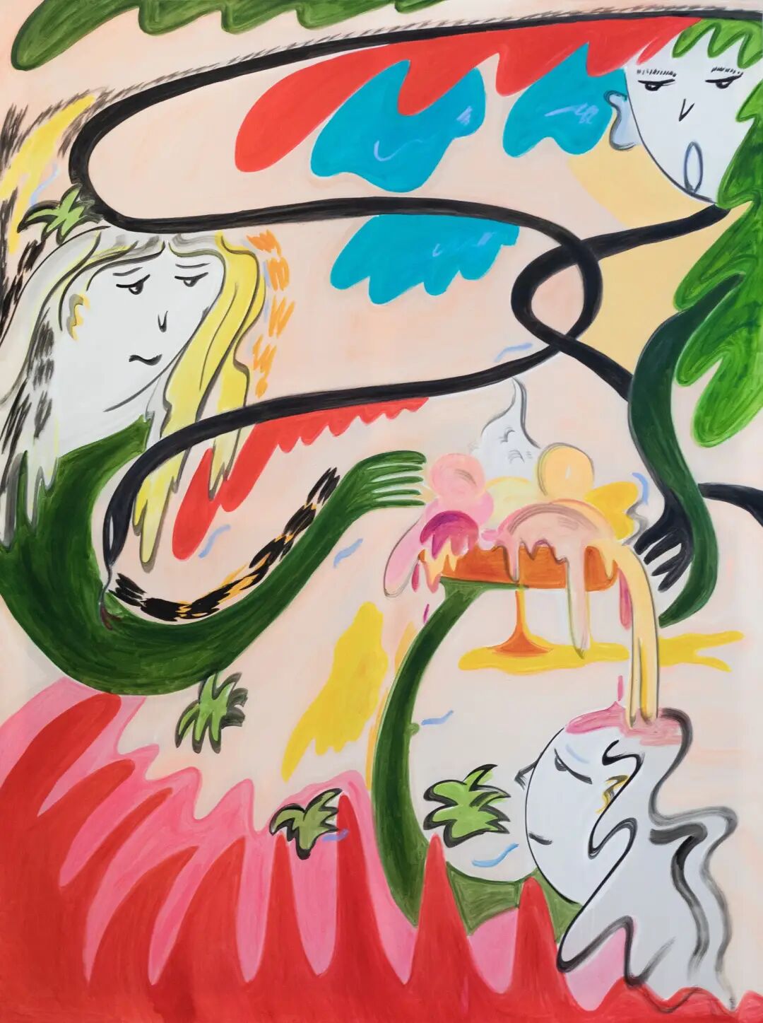 这些绘画以半抽象的田园和明亮背景中拟人化的人物为特征,并被包含象形文字和符号。她的作品探索了享乐主义、逃避主义和幻想的概念。