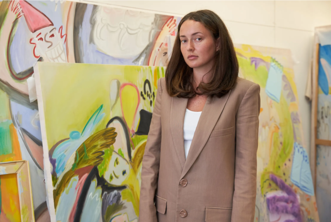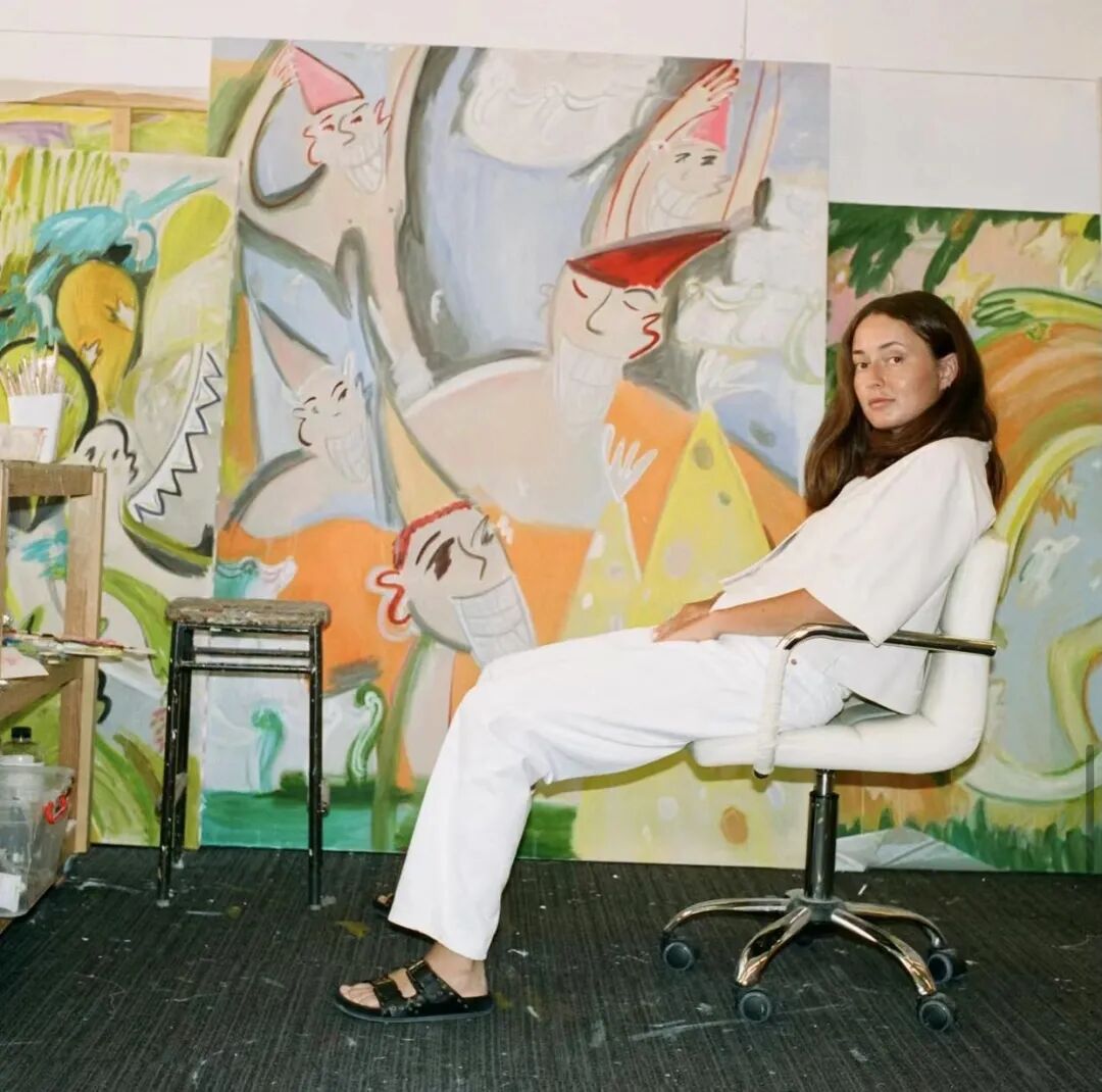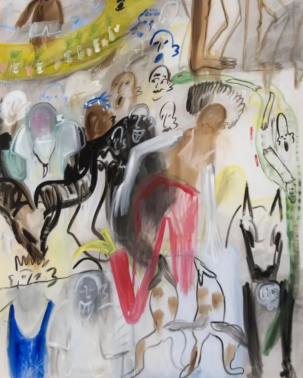 这些绘画以半抽象的田园和明亮背景中拟人化的人物为特征,并被包含象形文字和符号。她的作品探索了享乐主义、逃避主义和幻想的概念。