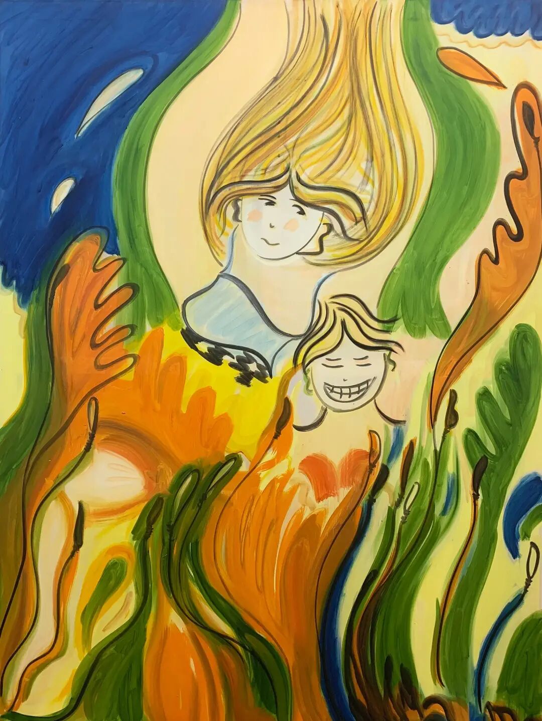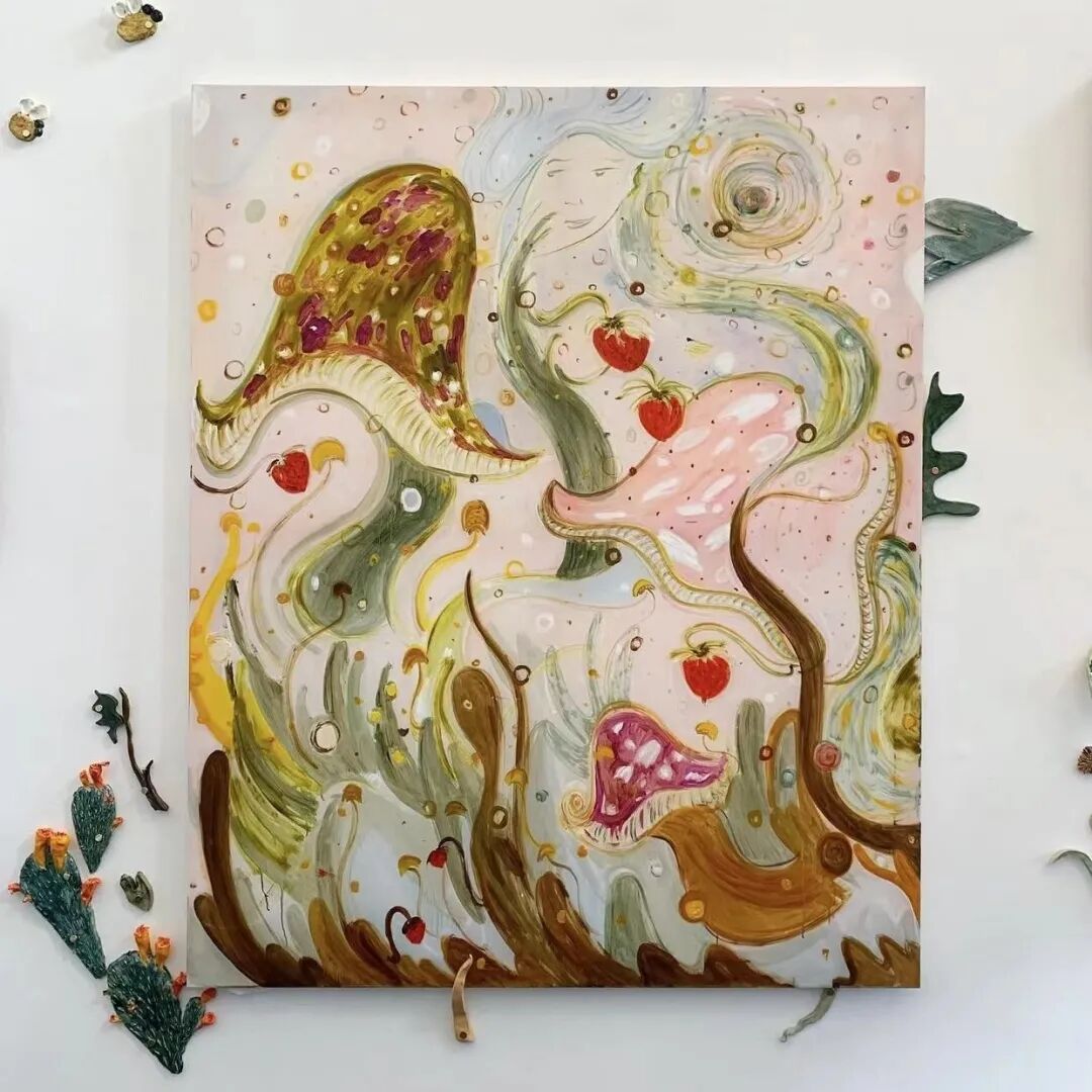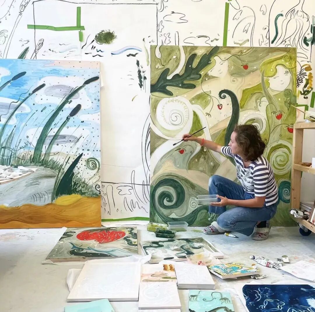 Yulia Ioslizon的作品大多取材于童年记忆和神话、拟人化植物,使用大胆绚丽的色彩和自由流畅的线条来描绘梦幻般的场景。她直接在拉伸的半透明丝绸上使用油和有机硅的混合物进行创作。她说,作为一种材料的透明和作为一种意义的透明一直在她的作品中碰撞