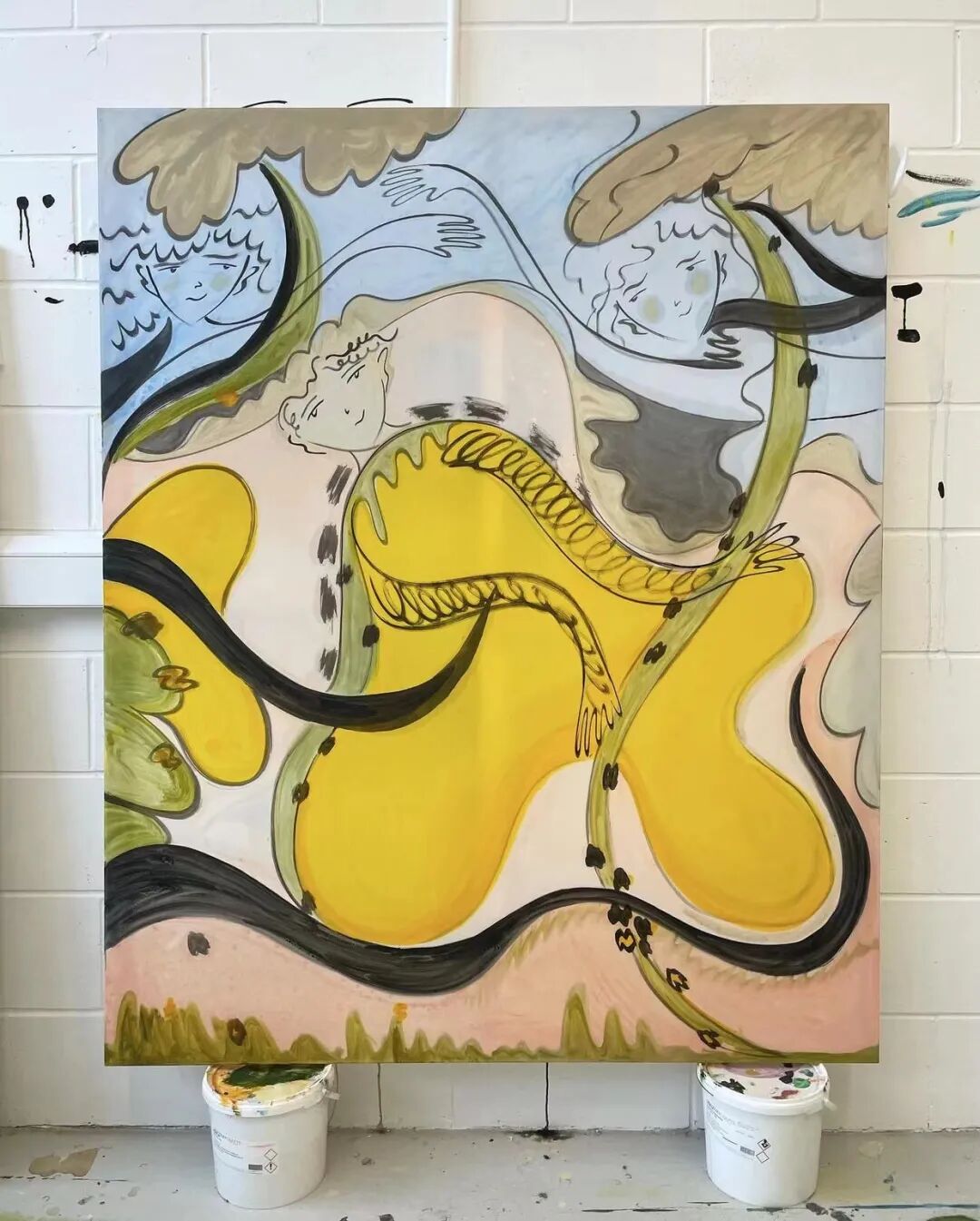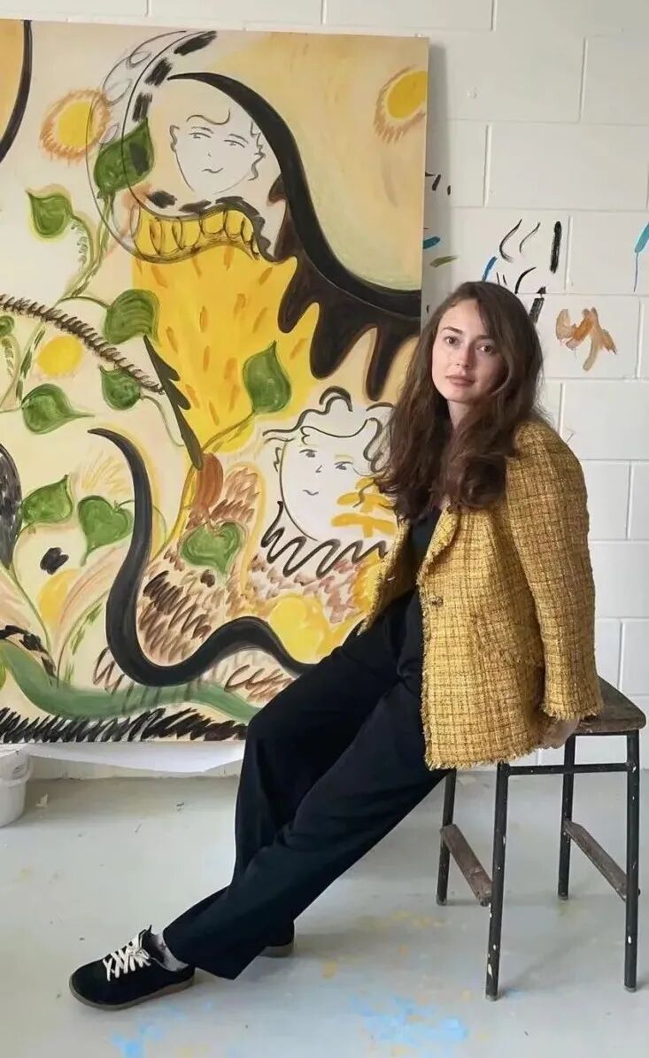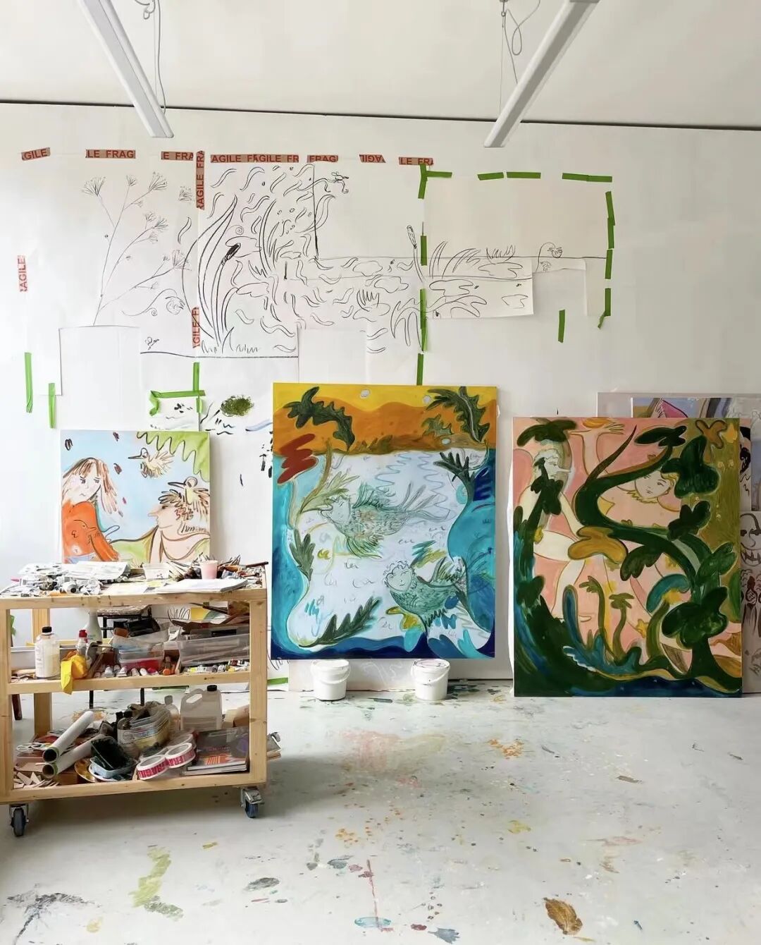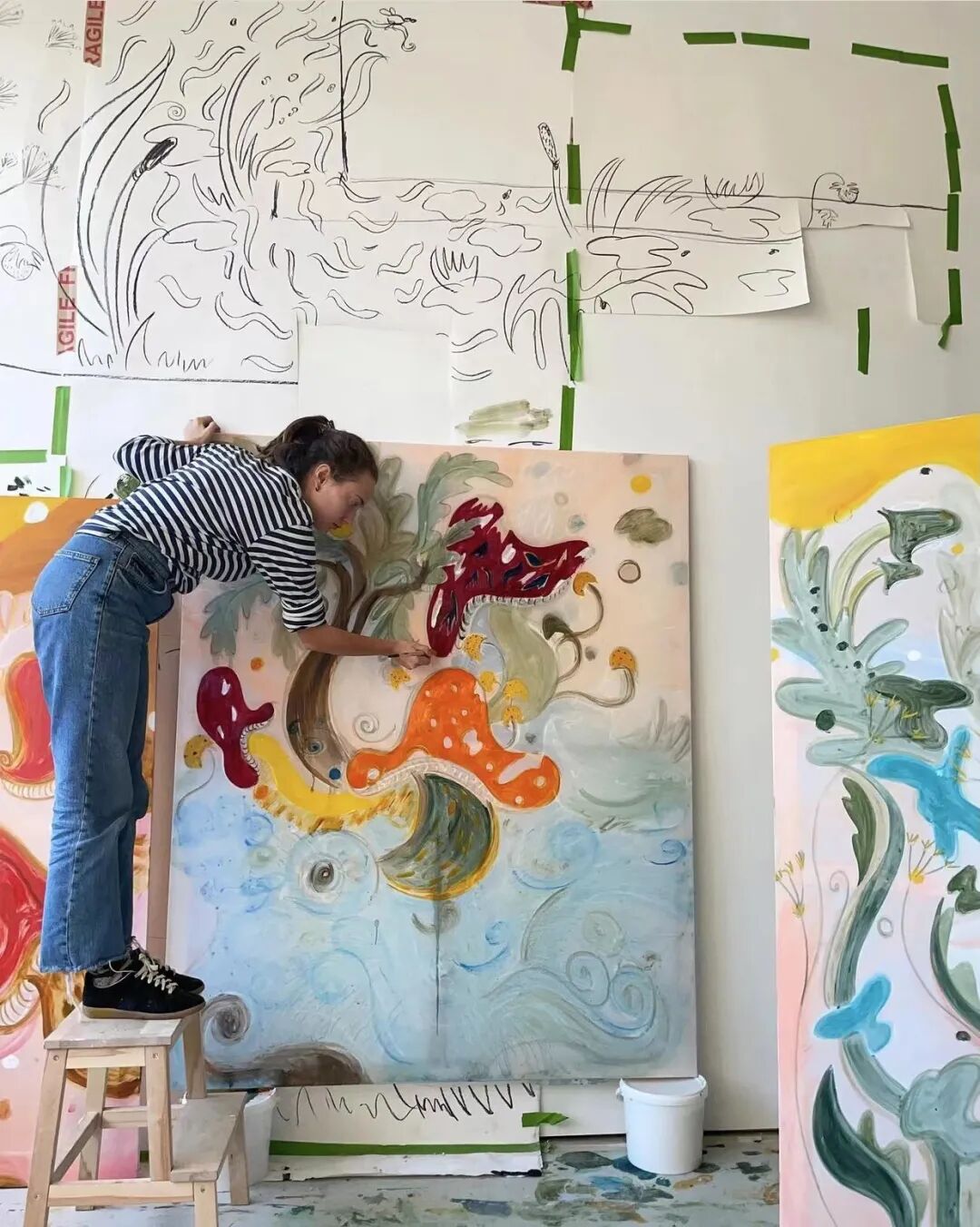 Yulia Ioslizon的作品大多取材于童年记忆和神话、拟人化植物,使用大胆绚丽的色彩和自由流畅的线条来描绘梦幻般的场景。她直接在拉伸的半透明丝绸上使用油和有机硅的混合物进行创作。她说,作为一种材料的透明和作为一种意义的透明一直在她的作品中碰撞