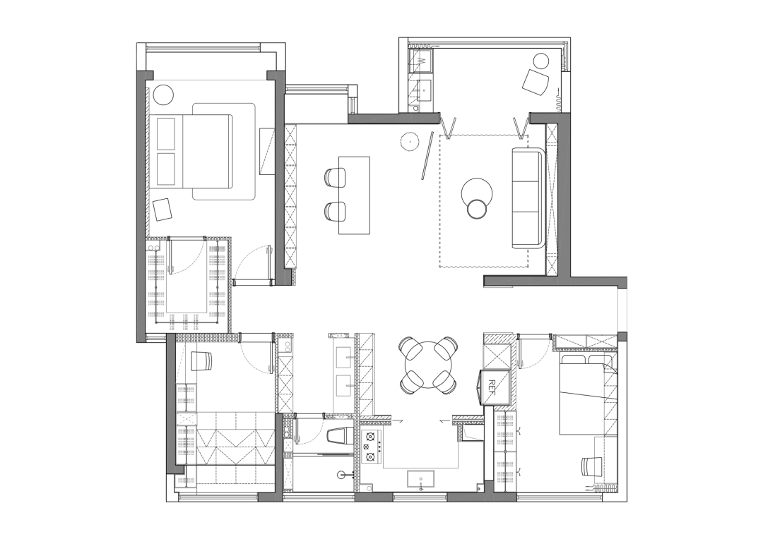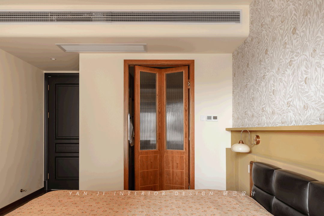 主卧是一个被承重墙夹住的窄长空间,我们将主卫改成衣帽间,卧室不再另外设置储物,让睡眠区可以沉浸在复古怀旧的气质中,不被杂物扰乱。