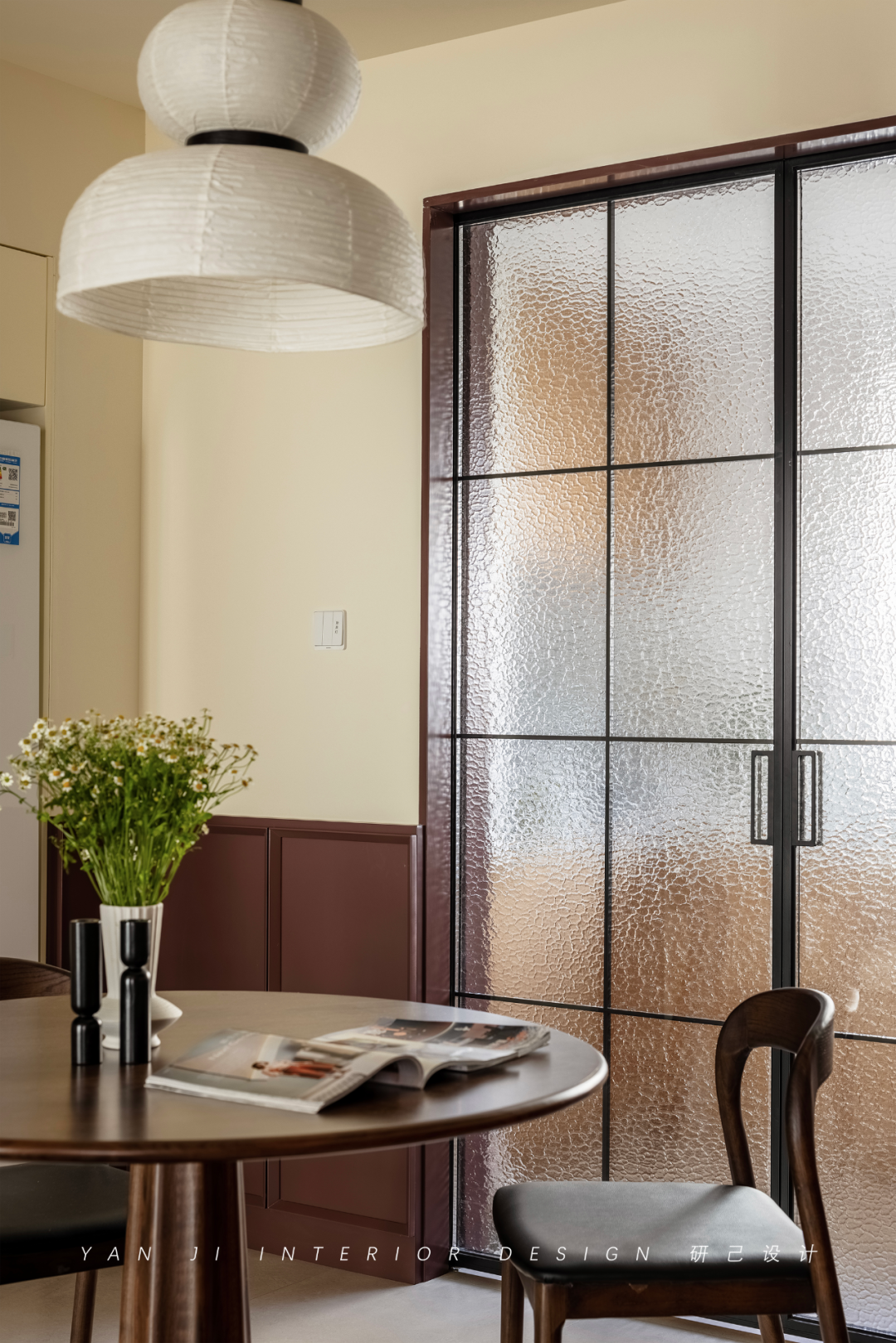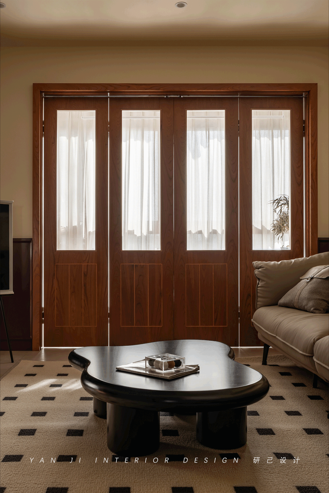 在日间,透过折叠门的阳光在这样的冬日里,也依然温暖明亮。因为户型限制,阳台门洞两侧都为承重墙体,无法做内包,我们便利用折叠门搭配木质门套,做出老上海的厚重复古感,反而丰富了空间层次。