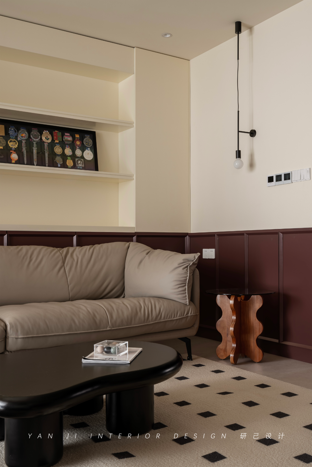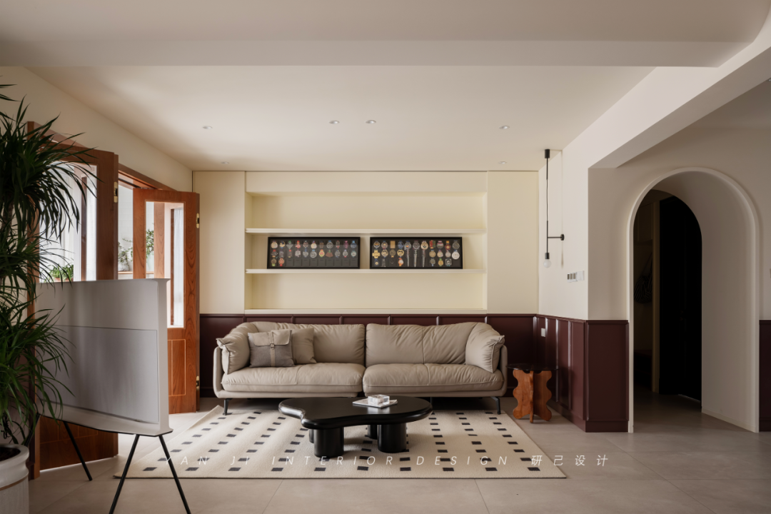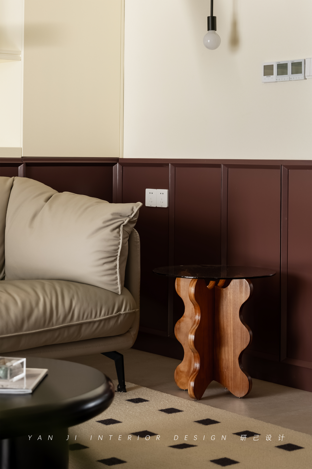 红色护墙板从玄关展开,与深色的软装搭配出浓郁复古感。木色异形边几和黑色异形茶几,依附在低矮的沙发边,吸引着人在这个角落惬意懈懒下来。躺在沙发上,一抬眼,阳台里养了很久的绿植透过木框分来绿意。