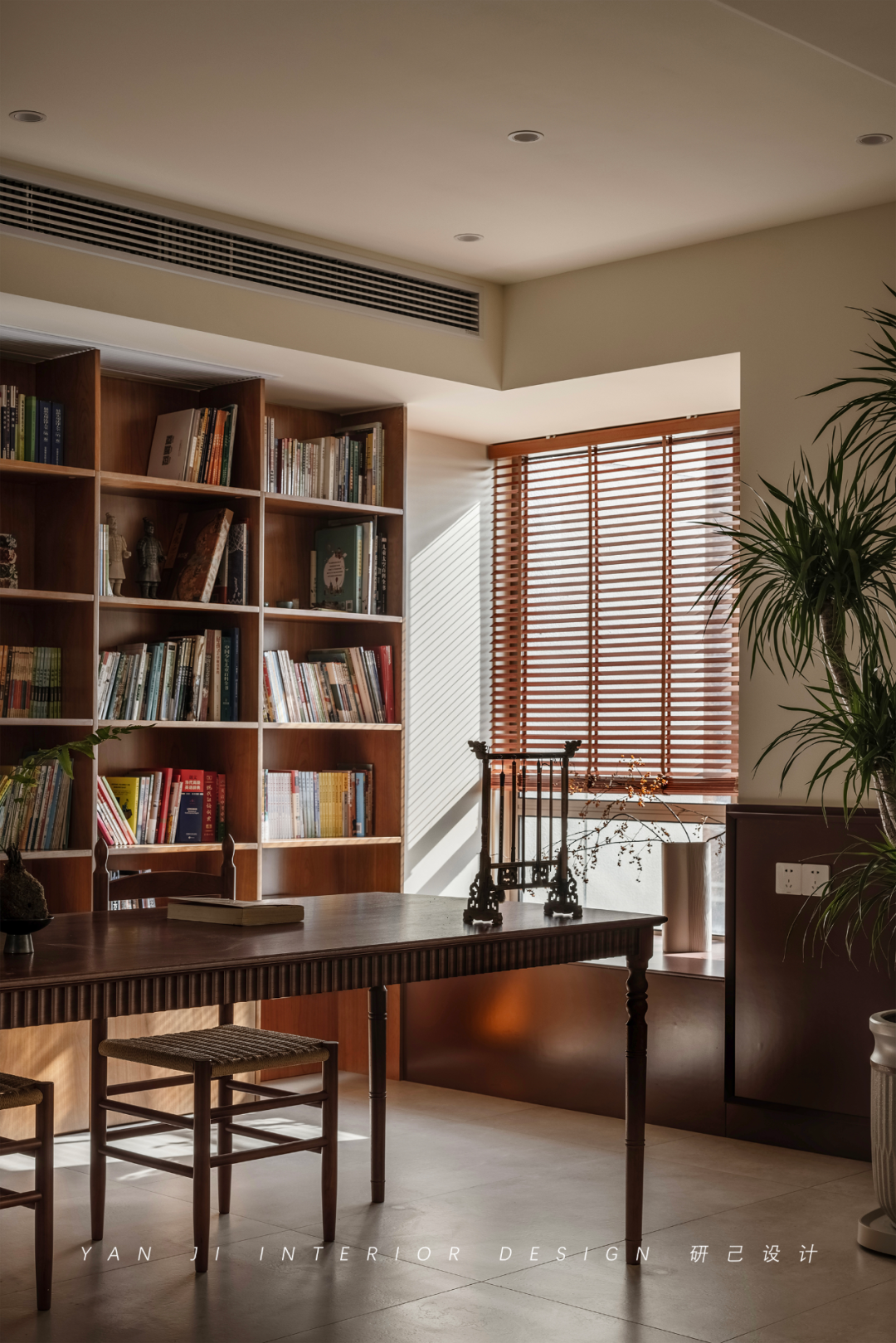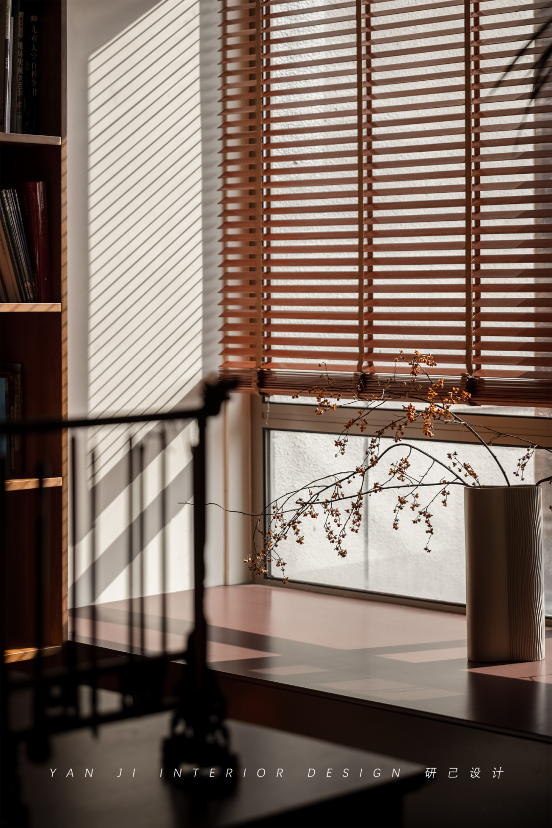 过去的书房,往往窗外有芭蕉、绿竹,虽然在城市住宅中难以实现,但还是可以看见屋主的用心经营。桌前一株几乎到顶的绿植,案头也有一点绿意,飘窗则有端景的意味:枣红色飘窗与深色木百叶,滤出复古的光影氛围,屋主会在这里陈设时令插花等。