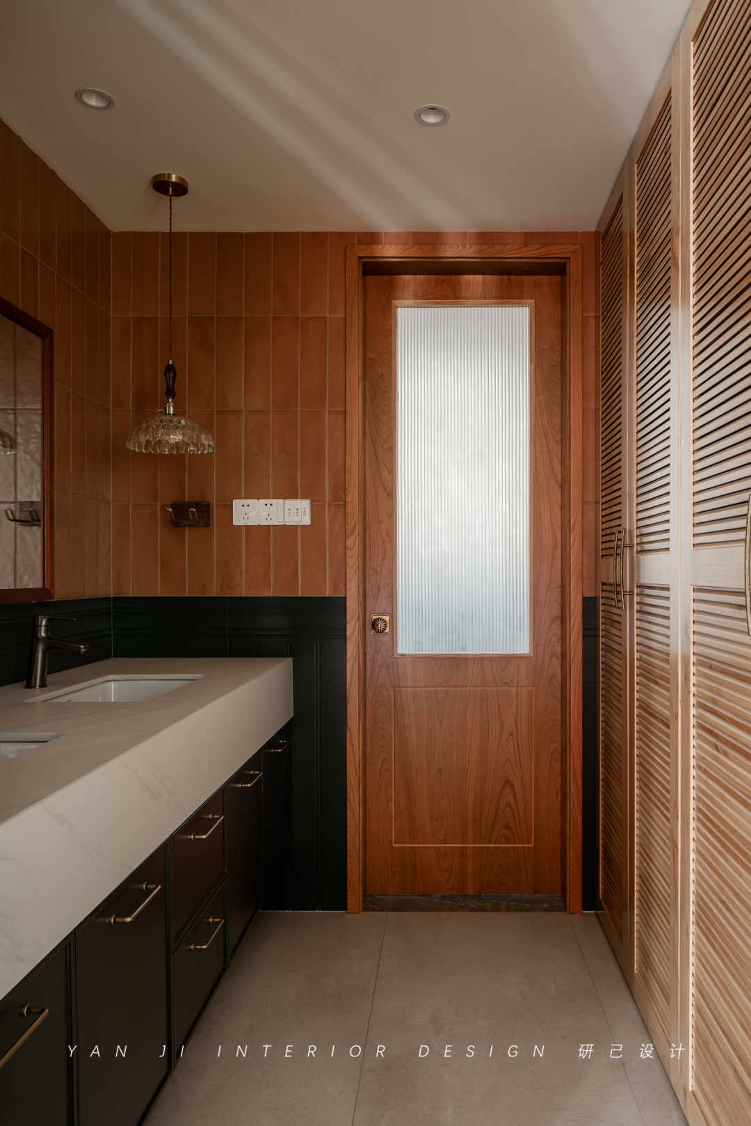 考虑到四口之家的洗漱动线安排,我们将洗漱区外移,设置双台盆,提升洗漱区使用效率。红砖质感的瓷砖搭配深色半墙、木色柜门与黑色柜体均搭配黄铜把手,还有精致的玻璃吊灯,让小小的空间铺满浓郁的南洋复古感。