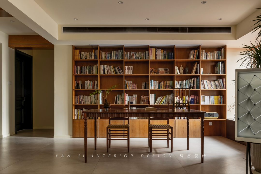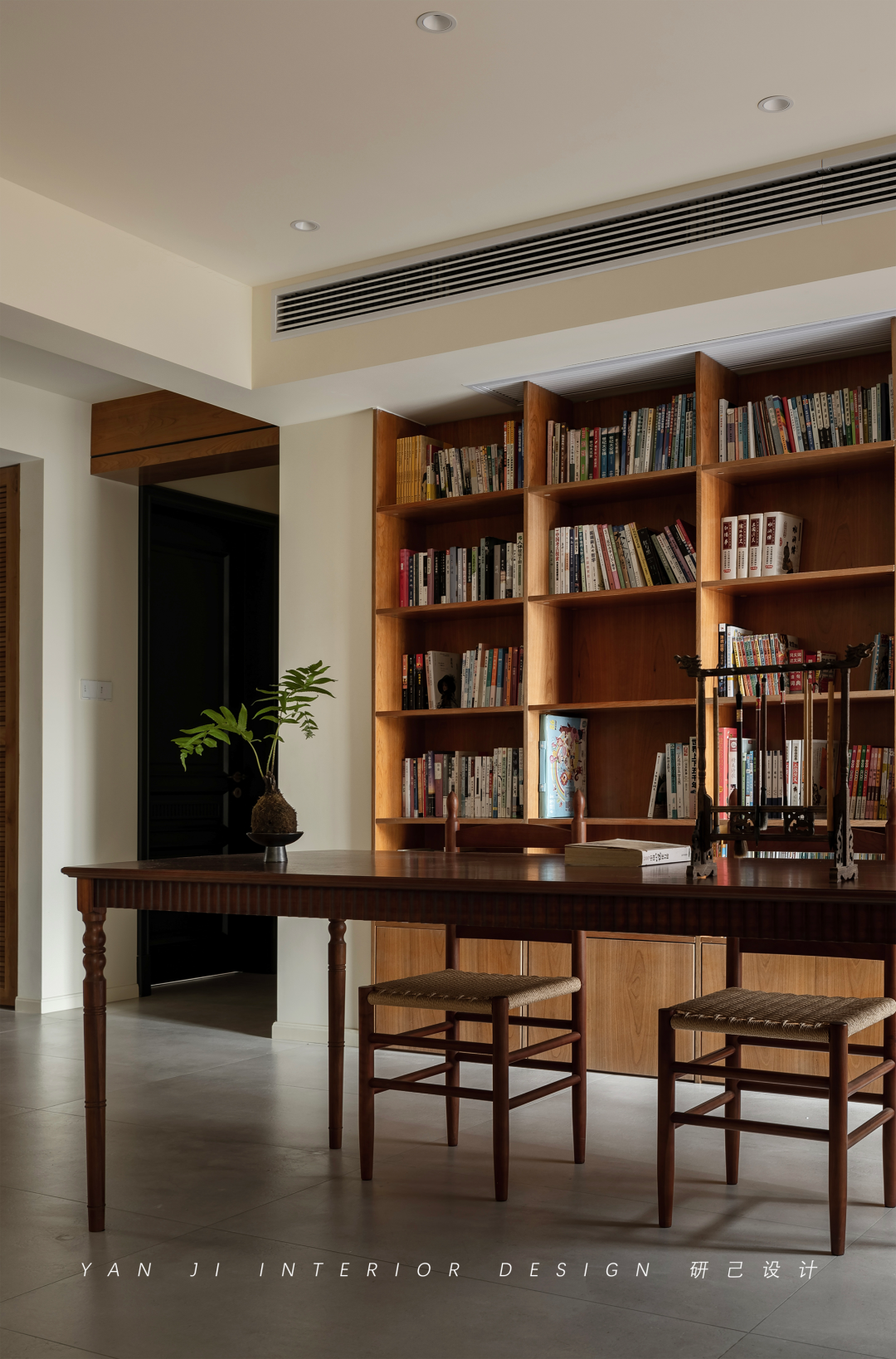 长桌一端摆着笔架,到顶的书架也满了大半——底层是小朋友的各类教材、科普小书,上半部分则是男女主人的书籍。书架做成嵌入式,留够进深,让这些大大小小的书籍都能被妥帖安放。大体量书柜在开放的环境中,也为书房提供了安稳沉静感。