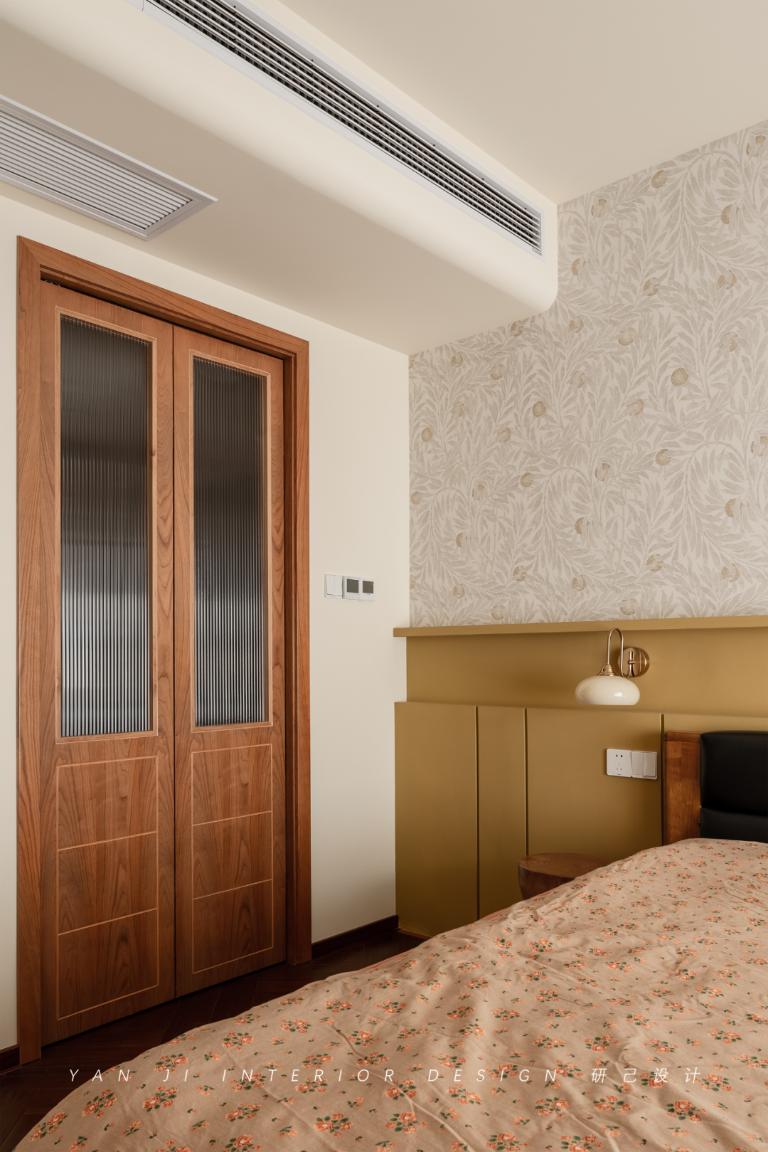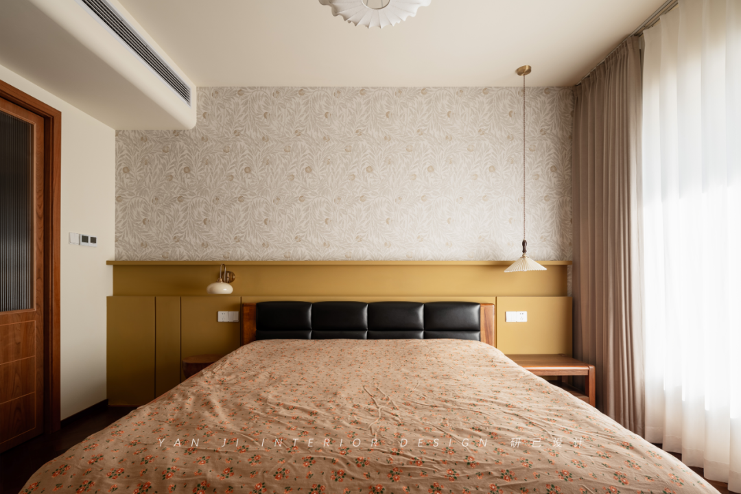 木框玻璃推拉门、风口下方的弧形转角处理,都是为了让这个小空间尽可能地通透圆融。特别的是,屋主以往购买的家具,比如床铺,和中古黄搭配浅色壁纸的床头背景墙浑然一体。虽然是交由他人设计的新家,旧物依然能找到自己的位置。