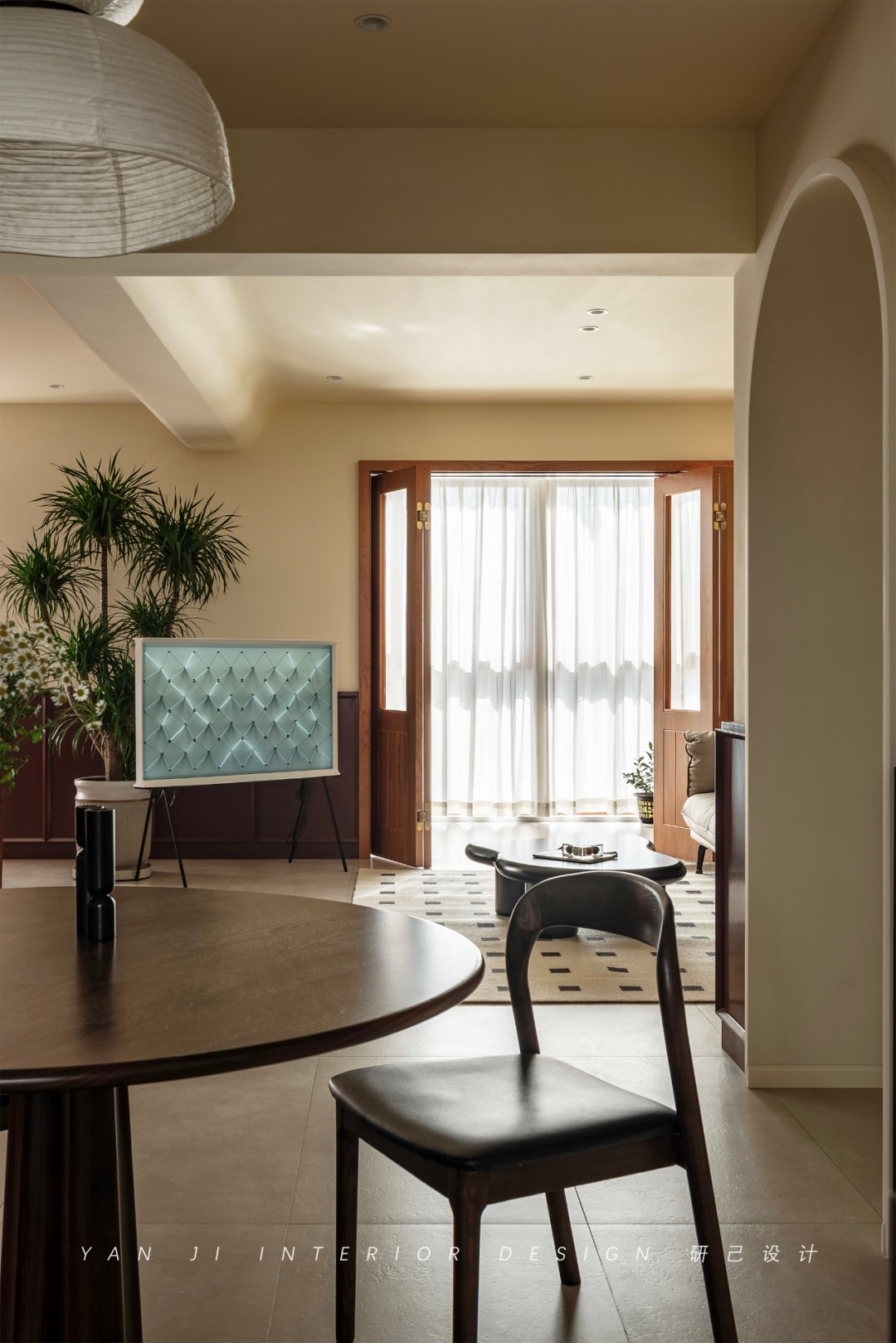 穿过拱形玄关,是开放一体的客厅、书房与餐厅。顶部梁体不做过多修饰,使用浅色偏暖的墙漆通刷墙顶,柔和空间线条的表情,搭配浅灰色地砖,角落里的可移动电视,营造简约整洁的空间印象。