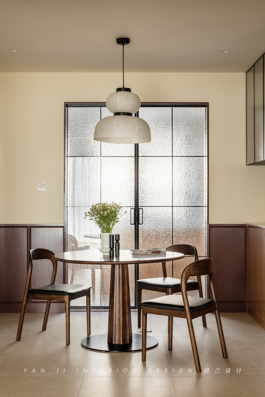 利用细框玻璃移门,厨房可以在封闭与开放间切换自如。厨房内部则是利用原木搭配黄铜把手、灯具,营造出精致的复古感,白色岩板搭配小方砖,带来清爽干净的感觉。