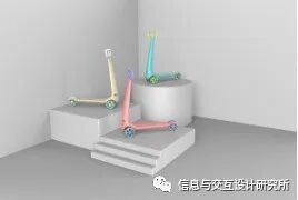 对把手进行高度自由调节,以达到舒适的高度;同时滑板车还具备折叠功能,减少占用空间,便于携带;最后,为了迎合儿童的心理,该款滑板车共有三款配色方案,为其提供更多的选择性。滑板车配色效果图如图6所示。
