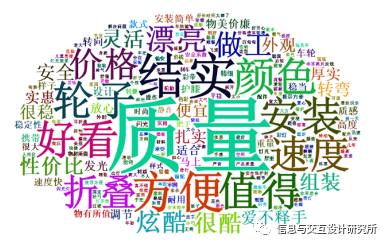 本文以儿童滑板车为例,率先通过爬虫软件Python对天猫上某款儿童滑板车的用户评价进行数据爬取,爬取范围为近1个月的用户评价信息,共计2000余条;然后对其进行数据合并与清洗,再利用结巴分词技术对爬取的数据进行分词处理;最终制作用户需 求词云图.如图4所示。